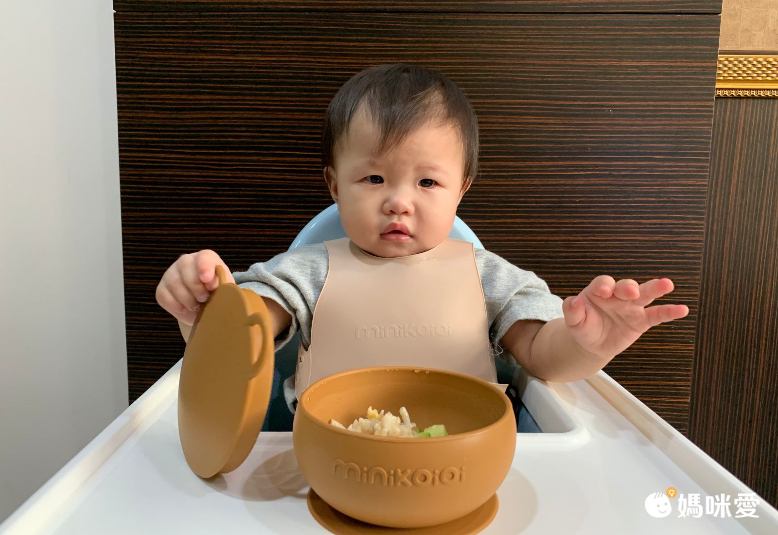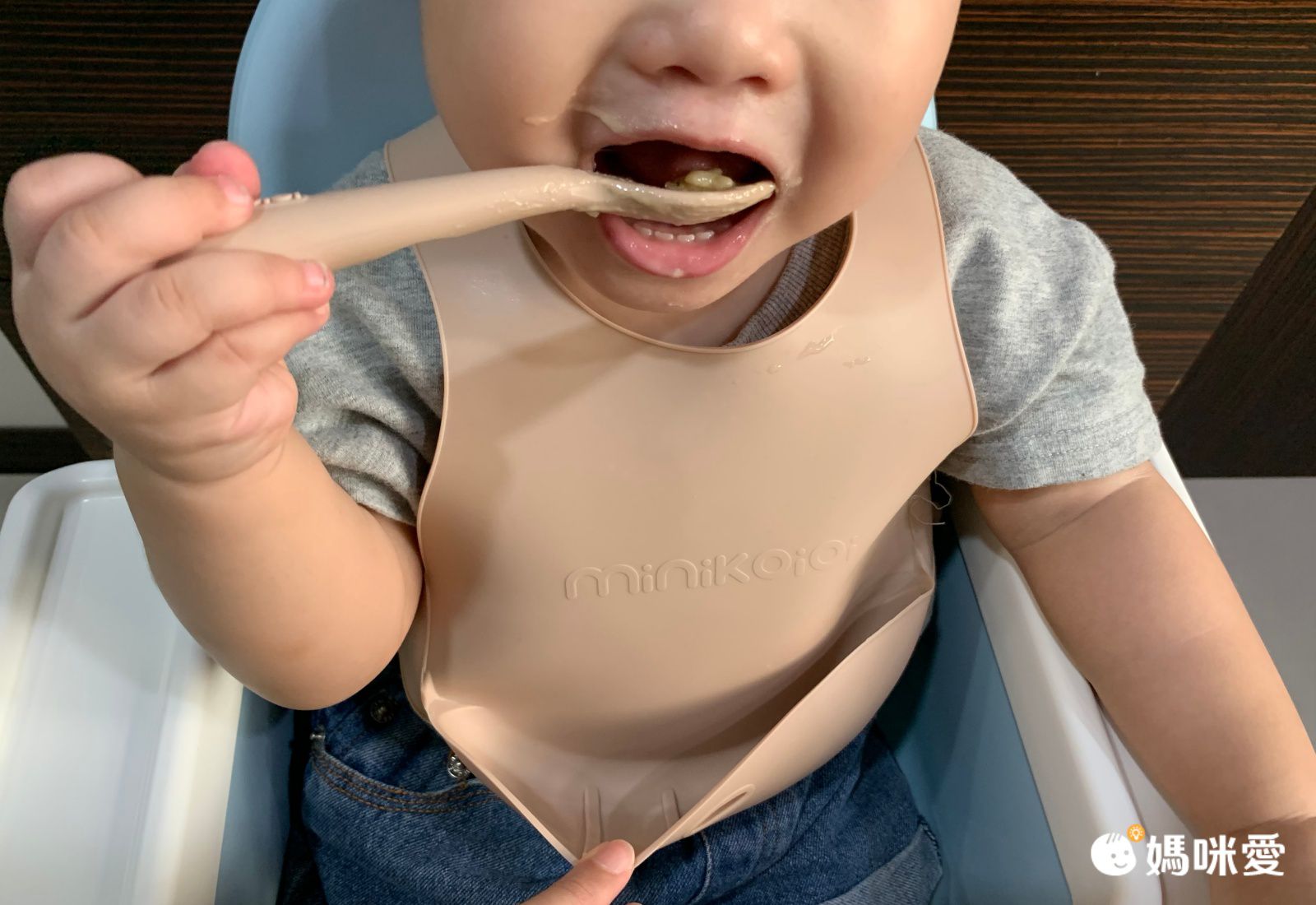 minikoioi 圍兜很特別,採用背心設計,讓寶寶感覺像穿衣服一樣,梨窩媽覺得很新鮮,但其實有一點小緊張,因為怕波波不能接受!她是連睡覺都不蓋被子,不喜歡身上有東西壓住的孩子,沒想到她很開心用餐,並沒有任何不舒服,我想應該是很軟Q,自在度很高吧!(大悅~~~)