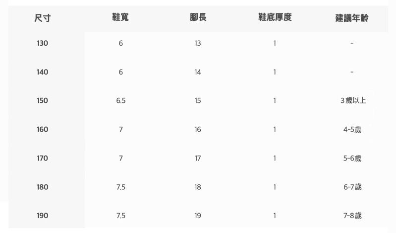 尺寸表由左至右為:尺寸、鞋寬、腳長、鞋底厚度、建議年齡,建議胖腳寶寶可以買大一號~