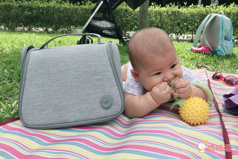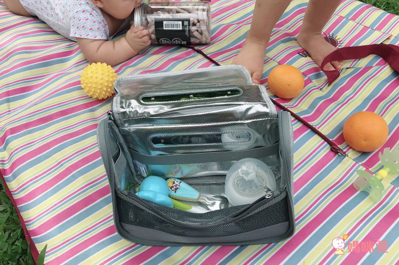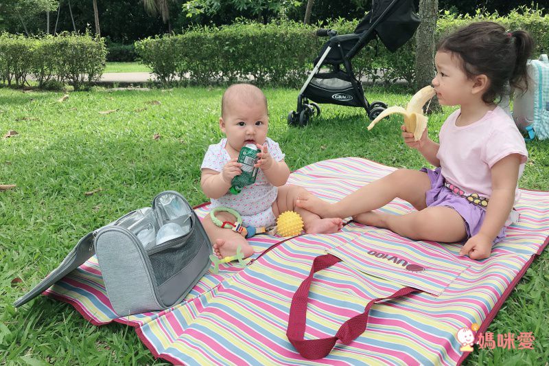 天氣好想要去公園野餐,妹妹的玩具,姐姐吃東西需要的餐具,放到消毒包裡,再帶些水果飲料就可以出門了。消毒包體積不大,放在推車下面也沒問題。