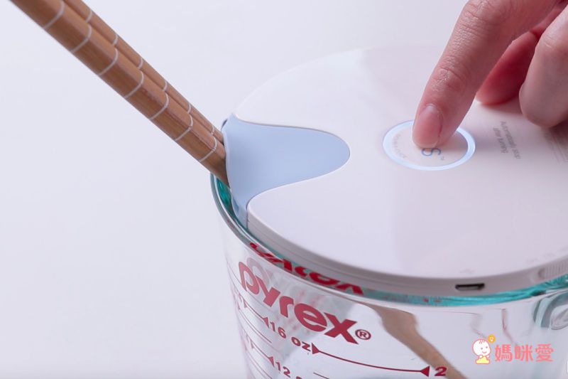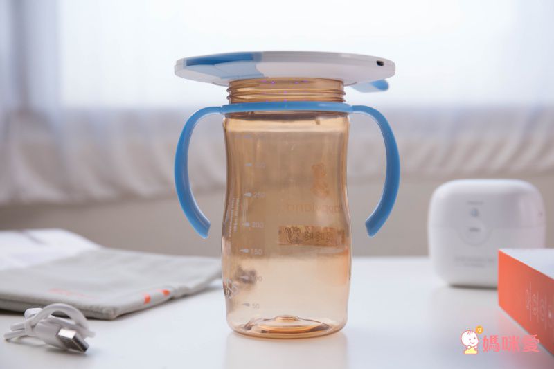 最喜歡的一點是它的使用很簡單,畢竟媽媽有太多東西要忙,越簡單越得媽媽心啊!充好電後側邊開機,把奶瓶、集奶器放在他的正下方按兩下就會開始消毒(請務必Click兩下開機,翻轉時如有聽到異聲,為水平儀零件,請放心使用。)