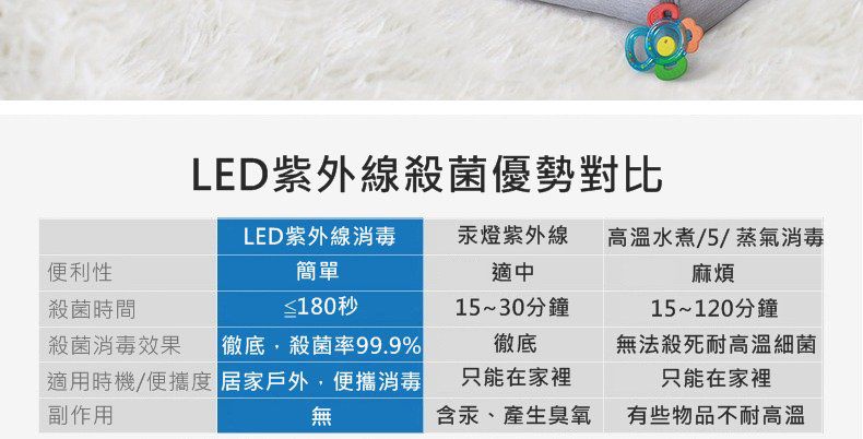 以前常聽說紫外線燈管照射奶瓶或固齒器,會因為紫外線的熱而加速脆化,現在不用擔心囉!因為 59秒 領先開發成功的這款產品,UVC LED殺菌不會造成熱效應產生,請媽咪放心使用
