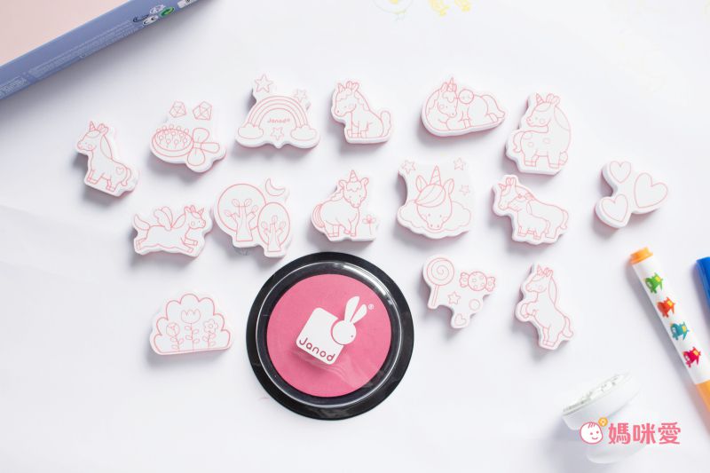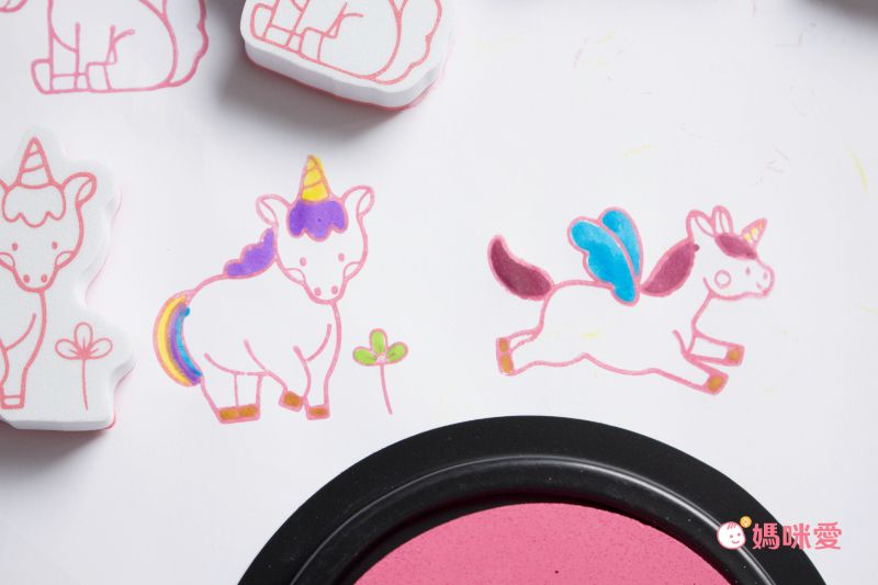 看到這個~不僅女兒喜歡,連媽咪自己都雙眼發亮!超夢幻的粉色獨角獸,有的在奔跑,有的淘氣地坐在地上~搭配粉紅色的印泥,足以把媽咪的少女心給激發出來🌸!