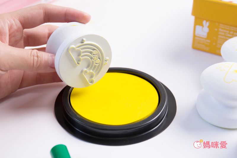 拿起三色筆印泥,輕輕拍打在印章上,可以互相搭配,色彩飽和度高、快乾、不暈染。四歲的Ethan經過媽咪指導,也可以輕鬆駕馭!