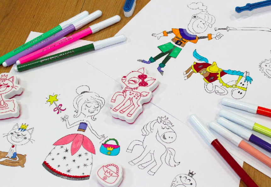 姐弟倆玩完印章之後,開始幫搭配好的公主著色,上了色之後畫面更豐富了!