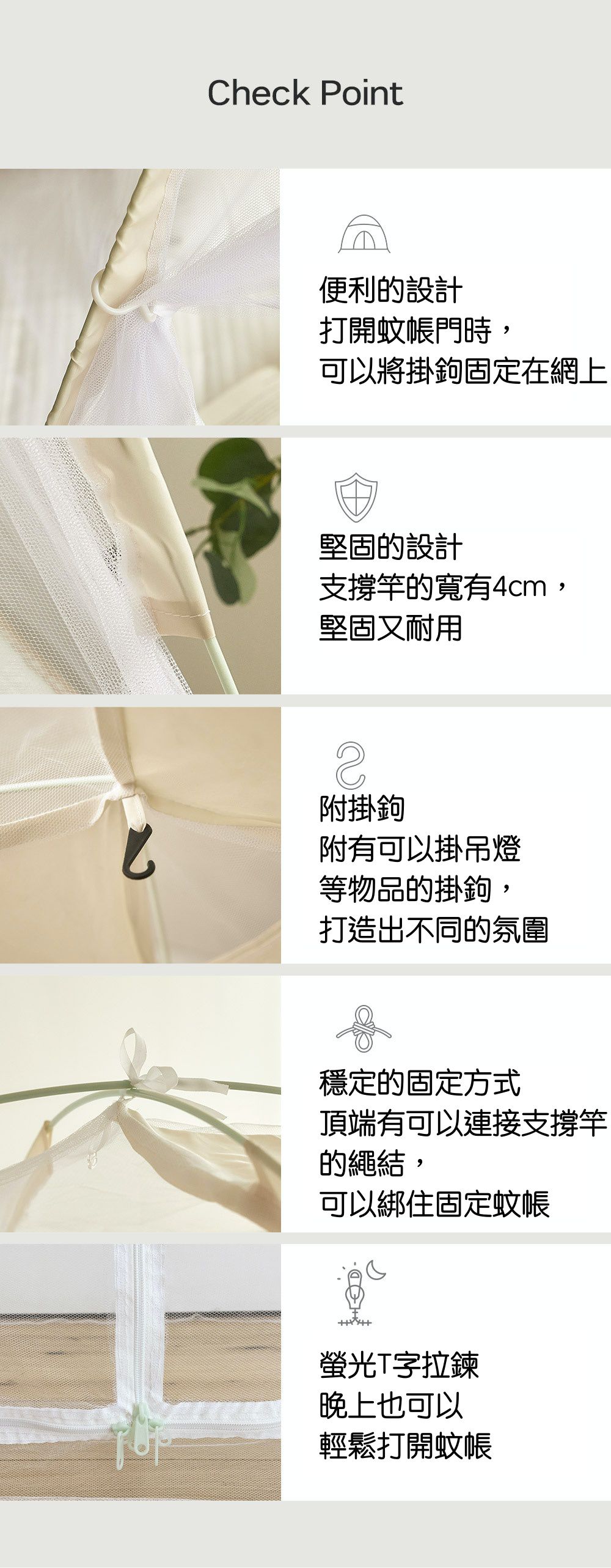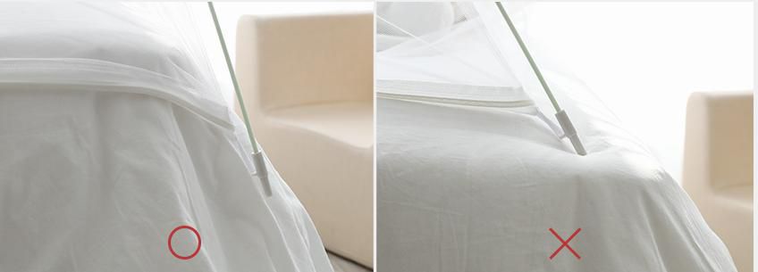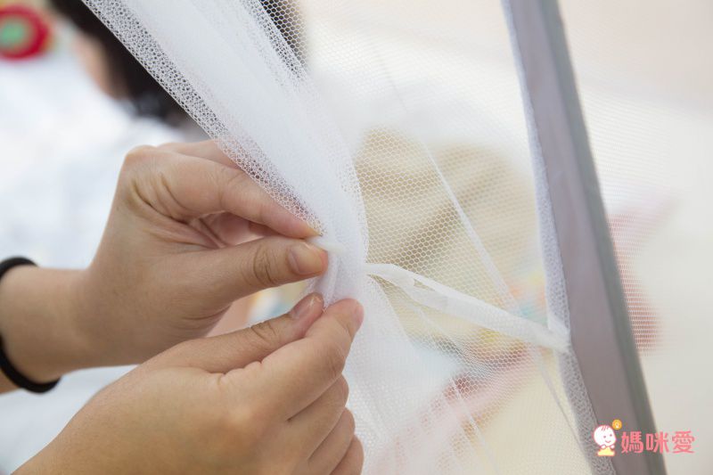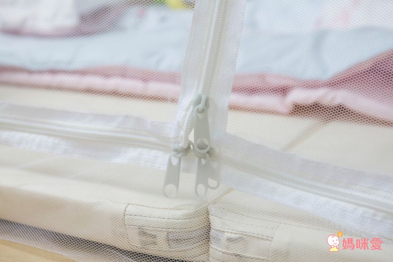 蚊帳跟帳篷設計類似,有三方向的雙面拉鍊(裡外都可以拉),可以依照需求打開,也很方便再關上!拉鍊可以拉到底,就不會有蚊子飛入~