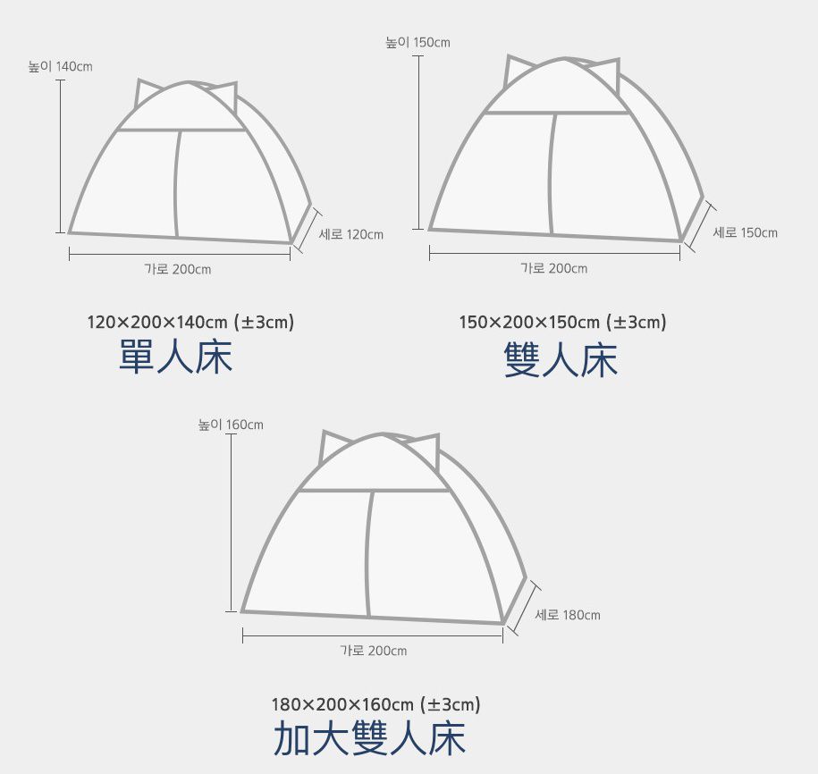 尺寸:單人床120x200x140cm(±3cm) 收納包直徑75cm / 雙人床 150x200x150cm(±3cm) 收納包直徑75cm / 加大雙人床 180X200X160cm 收納包直徑78cm