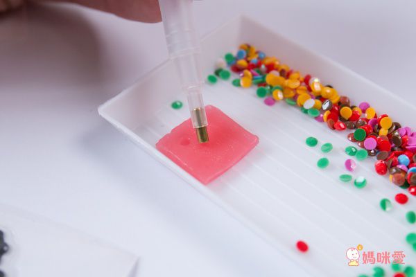 就可以用拼鑽筆沾附小鑽到主題貼紙上囉!由於貼紙上有黏性,所以輕輕將小鑽壓到對應的位置上,就可以固定住了!
