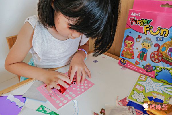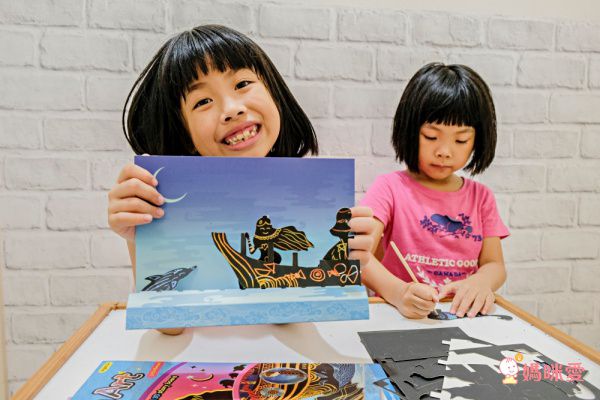 這些作品都很好上手,我們家米姐和希希都玩的好開心!像閃亮DIY刮貼畫就很吸引小孩喜歡,自已配色,貼出來的作品都是獨一無二的!媽媽在她們手作時也能休息片刻((呵呵