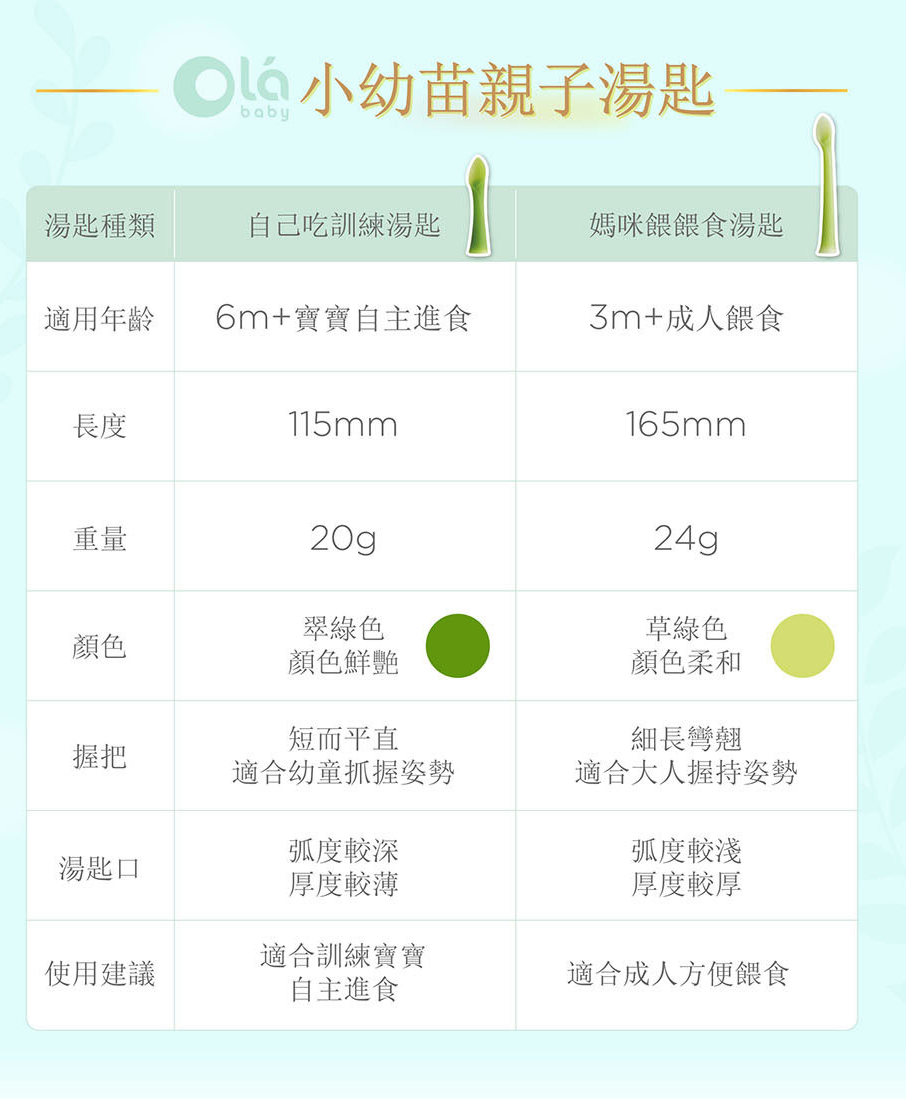 和其他品牌的餵食湯匙相比,可以看到Olababy 湯匙 的湯匙尖端比較尖,方便挖取食物。淺綠色的餵食湯匙握柄比較長,讓爸媽餵食的時候更省力!