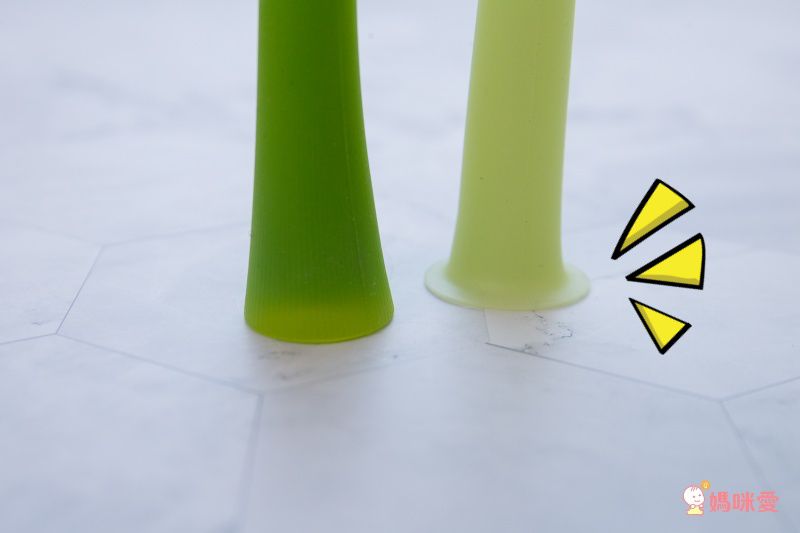 可以看到淺綠色的長柄餵食湯匙底部有設計吸盤,可以穩穩吸附在桌面上,不會東倒西歪,弄髒湯匙和桌面囉~