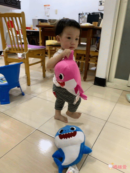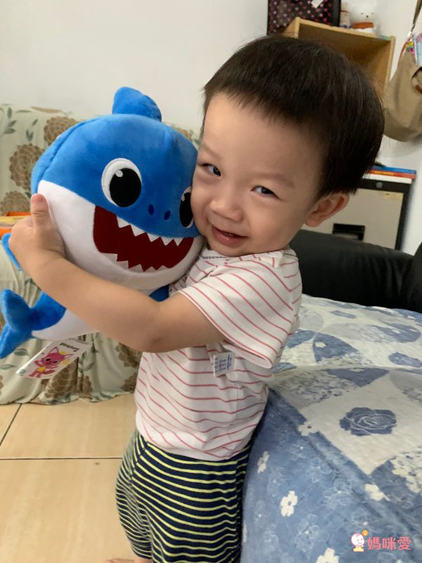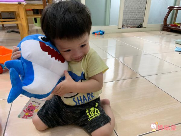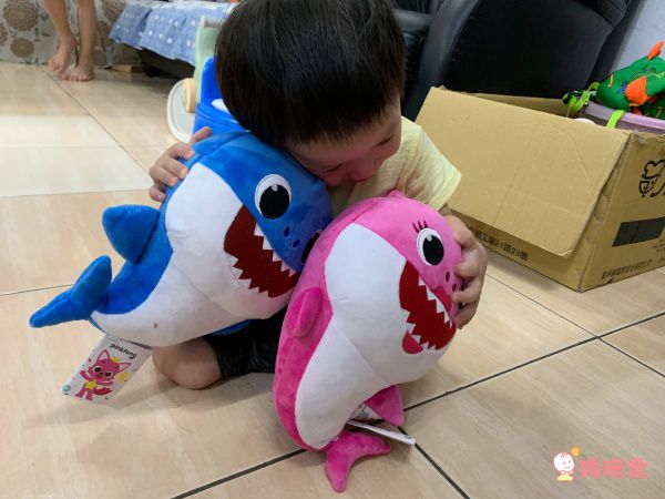 媽媽本來覺得小男生對於絨毛娃娃會興趣缺缺,第一天只是因為新鮮玩具所以很愛,沒想到隔天看到娃娃也還是能讓他愛不釋手,整天抱著娃娃走來走去!讓媽媽對於這兩位鯊魚寶寶大大加分啊!