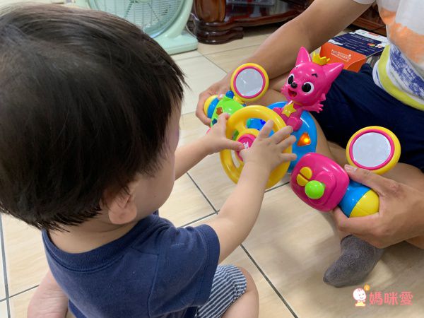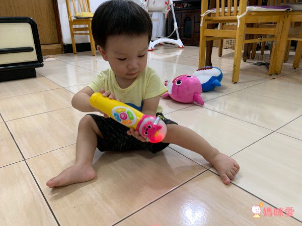 除了有閃爍的燈光按壓之後會有4首不同的音樂,其中當然還包含了韓文版的「鯊魚寶寶主題曲」,讓壯壯露出笑容並跟著音樂一起跳舞搖擺🎵