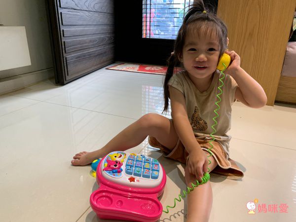 媽媽自從買了這款玩具之後,再也沒有小孩跟我搶接家裡電話囉!哈哈哈尤其是妹妹超愛角色扮演,這個玩具可以讓她扮演無上限!仿真的電話鈴聲超可愛的~方方正正很大的電話號碼按扭~妹妹也可以透過電話按鍵學習1234喔!