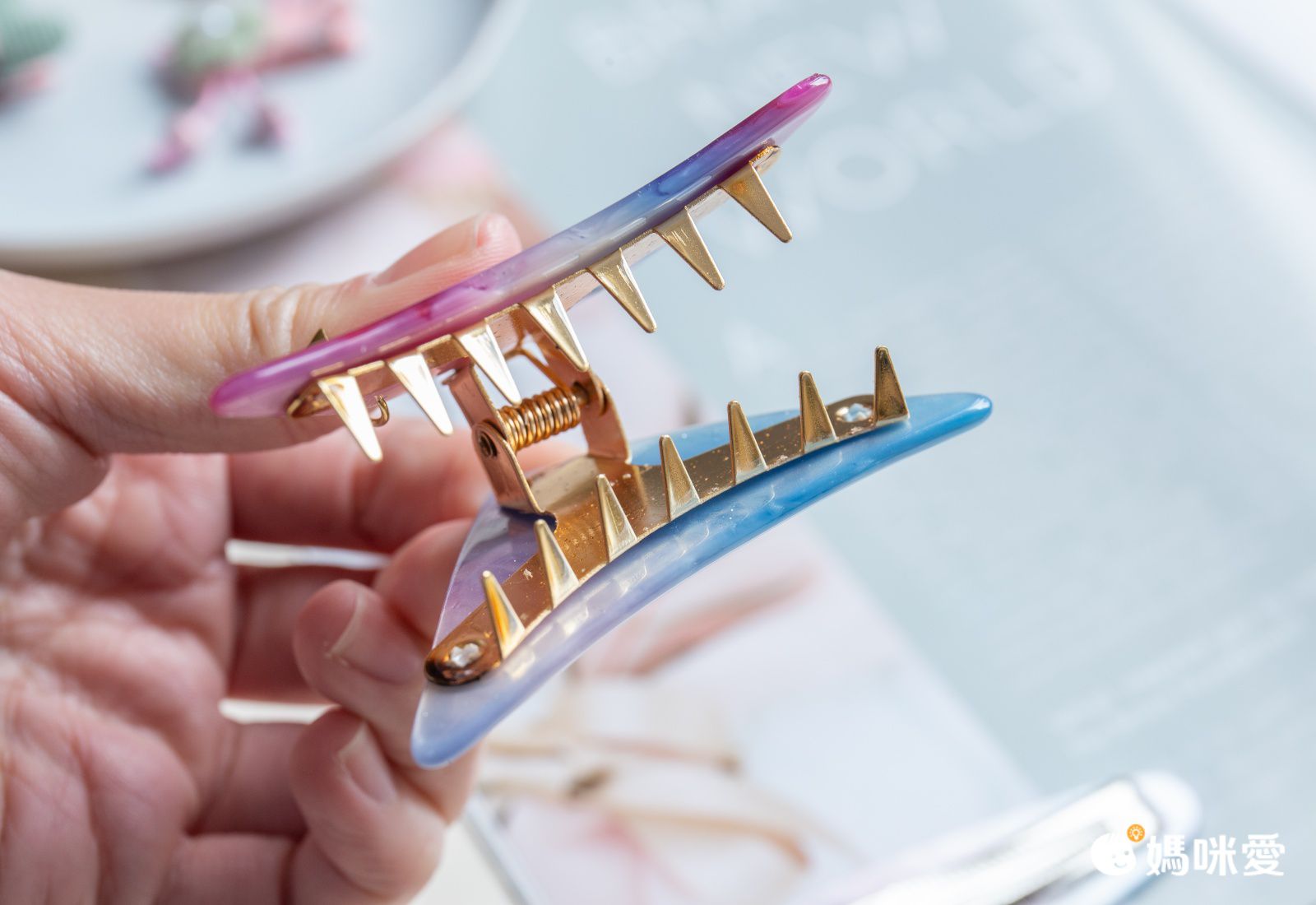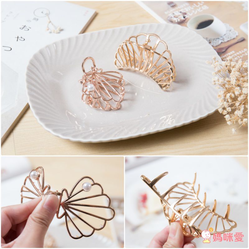 編媽摸到實體的時候就好喜歡呀!冰冰涼涼金閃閃的,貝殼的抓力比較鬆,適合夾橫的或丸子頭,扇形的就很有力,可直接俐落鯊魚夾下去