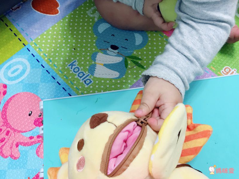 外表是可愛的小獅子,繽紛的亮黃色、亮紅色很吸引寶寶目光!,Tete最愛的就是扣扣子,自己扣成功好有成就感,Kitty最愛把鬃毛撕下來然後捉著尾巴咬。真的是名副其實可以從頭玩到尾呀!