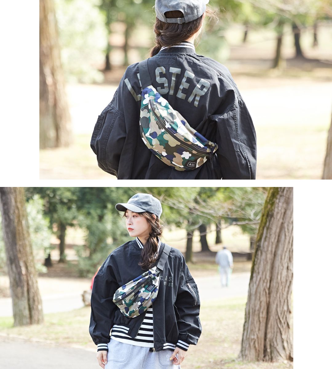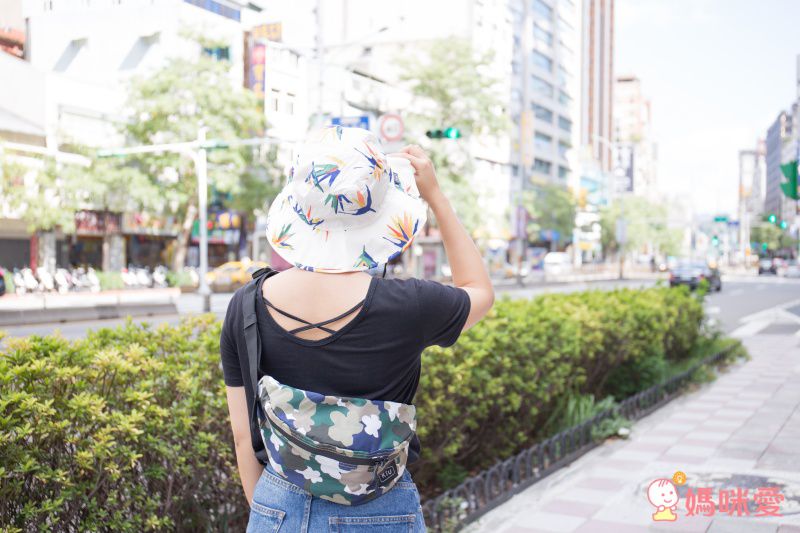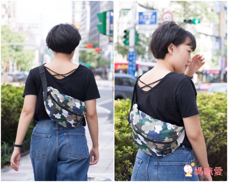 平常喜歡穿牛仔褲+T-shirt的短髮俏媽咪,配上迷彩花花造型的隨身包,一秒變得超吸睛