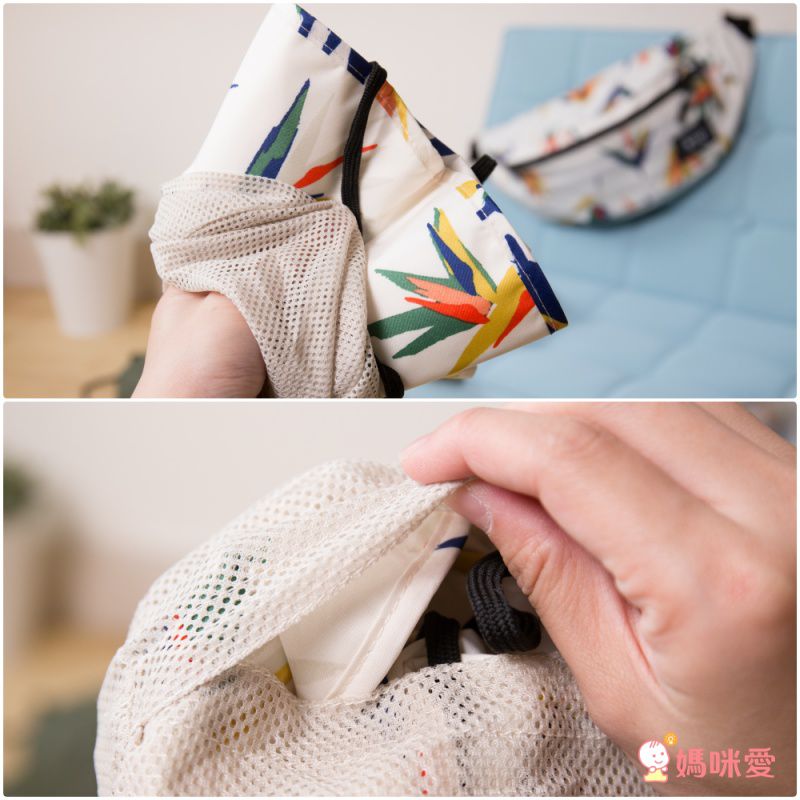 翻過來就是網狀透氣層,也是收納外層喔!方法很簡單,把手伸進中間的洞,直接抓住帽子反過來塞進去,就完成啦!