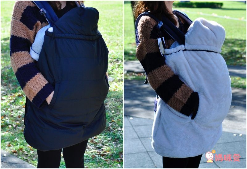 除了推車保暖外,當成背巾時也很好用噢~前方有個口袋,讓媽咪們可以把手放進去保暖~(不然冬天在外吹冷風,雙手可會凍得紅通通啊><)
