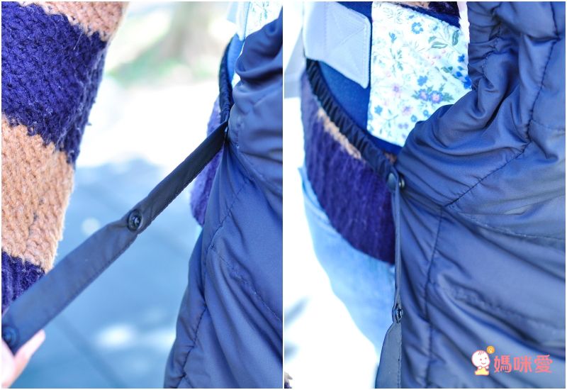 保護套下方延伸保暖寶寶的腳ㄚ ,看這長度用到兩三歲沒問題!而且,還有一條繩子可以穿到媽咪的背後,扣到另一邊(長度是可以調整的噢),這樣就可以固定好保暖罩了!