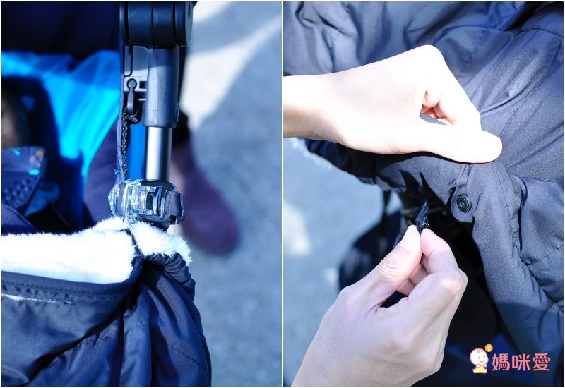 兩邊有扣夾可以夾住推車上的布套,三寶媽實測真的可以夾很緊,完全不會掉!!!還有一條帶子可以穿過推車下方,扣上之後就牢牢固定在推車上了~