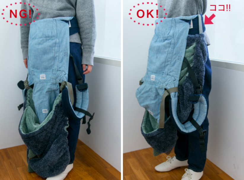 那是由於舊款在沒有抱小孩時,背巾保暖罩會像左下圖般整個垂落。但有了這個彈性帶固定後,就不至於卡到腳囉!