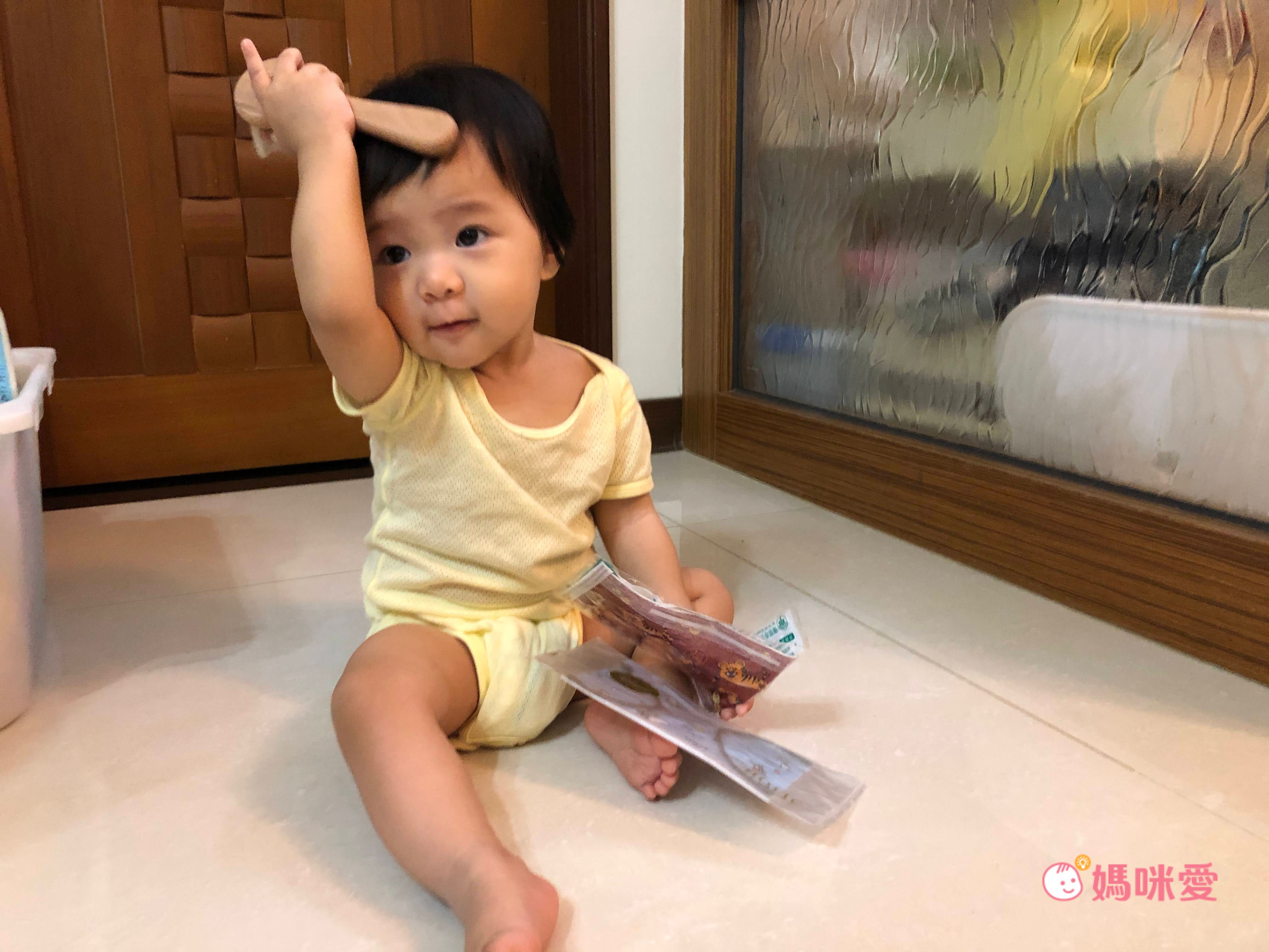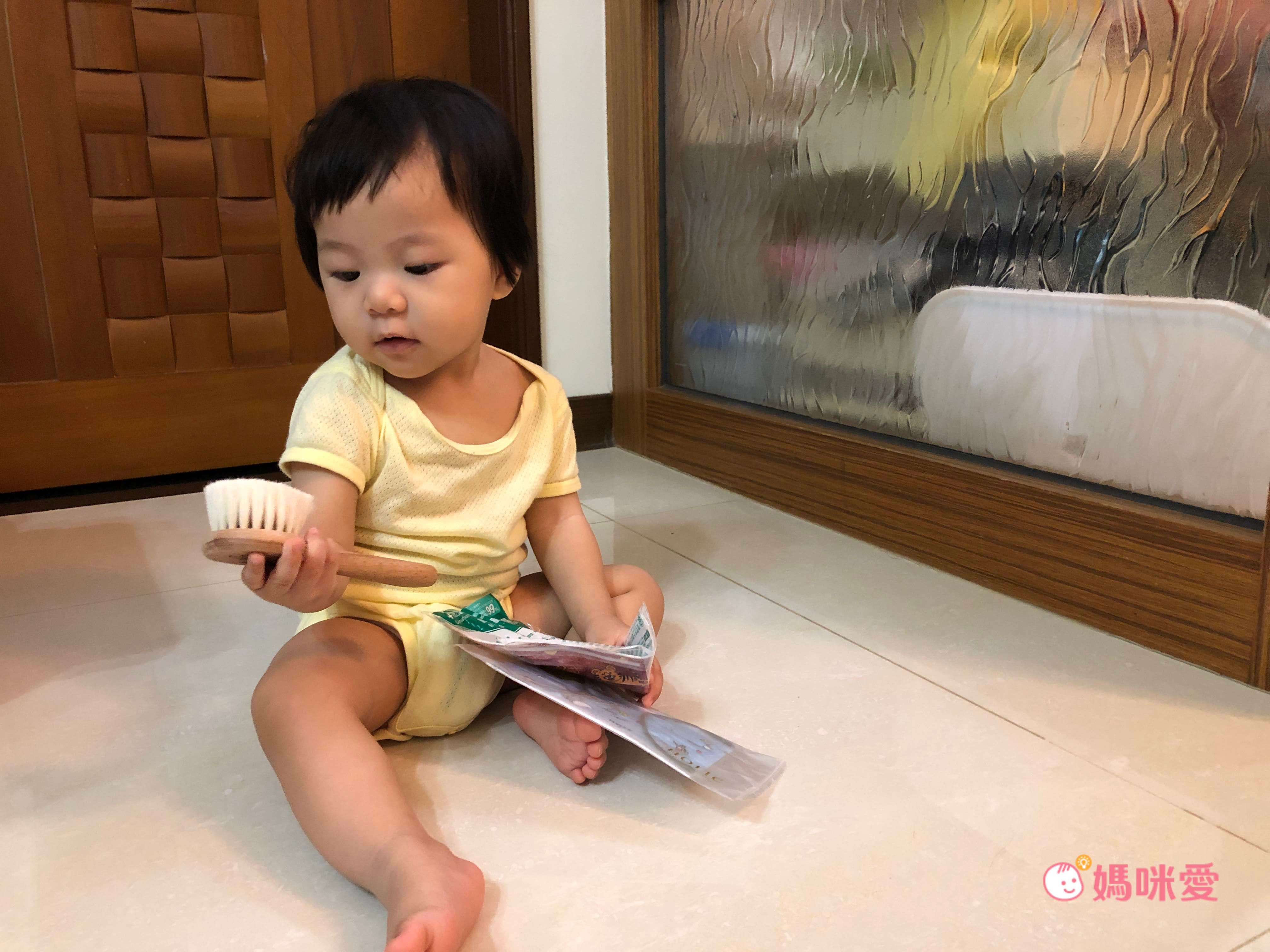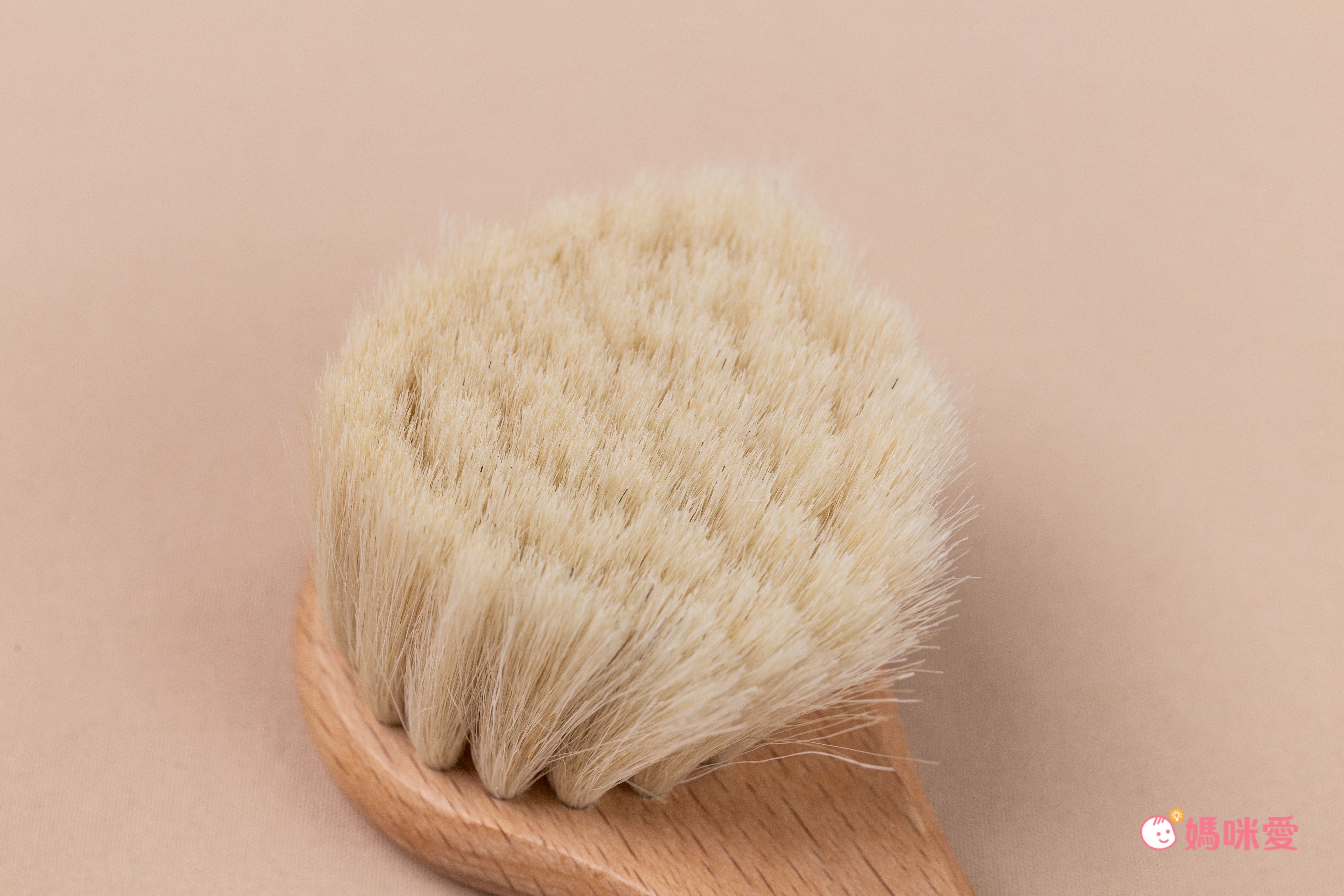 嬰兒柔軟羊毛梳有溫潤的木質手柄,大小剛好讓一歲妹妹好抓握,柔軟的山羊毛很適合梳理嬰幼兒的頭髮,連妹妹自己都愛不釋手呢!