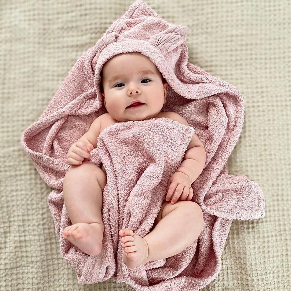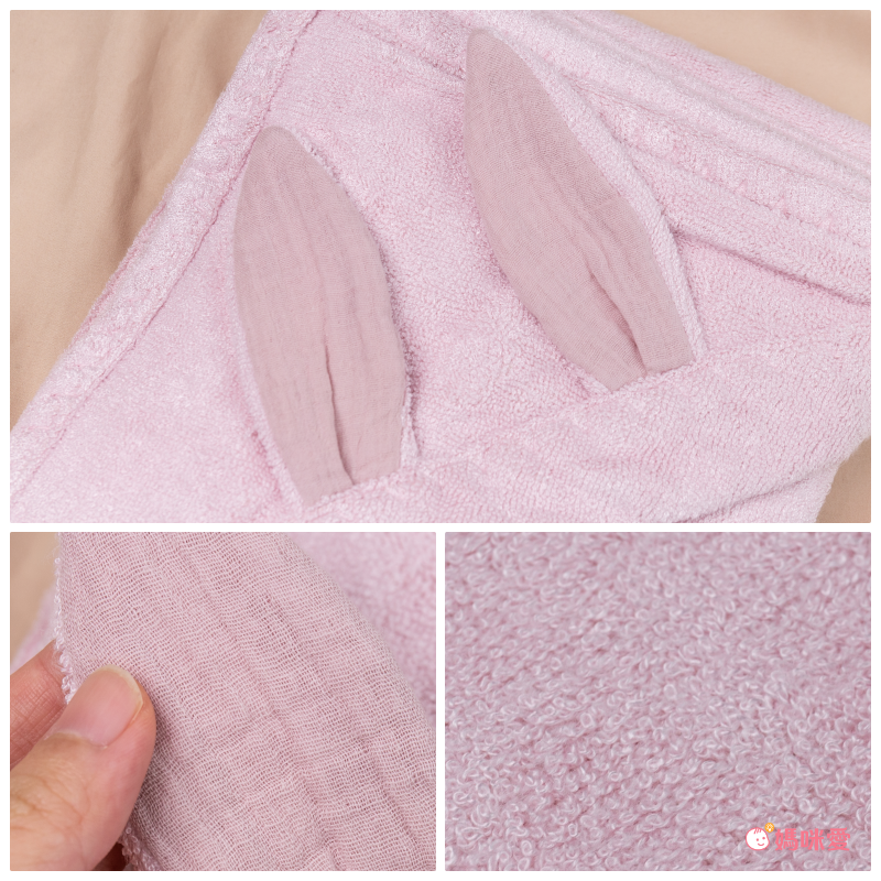 它是有點厚度的毛巾,寶寶包上後很快就能擦乾身體了!