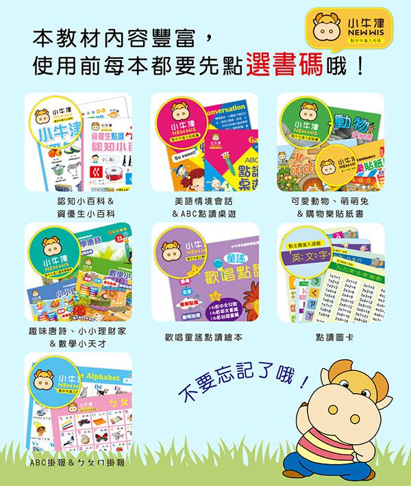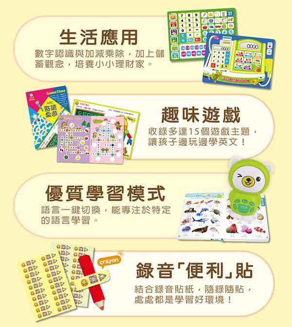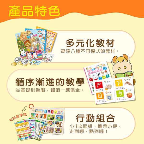 到底內容有多豪華呢?打開來拍照簡直太療癒!豐富全方位多元教材有☛ 1.點讀圖解認知小百科 2.點讀ㄅㄆㄇ認知小百科 3. 隨身雙面圖卡 4.美語情境會話 5.ABC點讀桌遊 6.趣味學唐詩 7.歡樂點讀繪本 8.數學小天才 9.小小理財家 10.購物樂貼紙書 11.萌萌兔快樂貼紙書 12.可愛動物貼紙書。