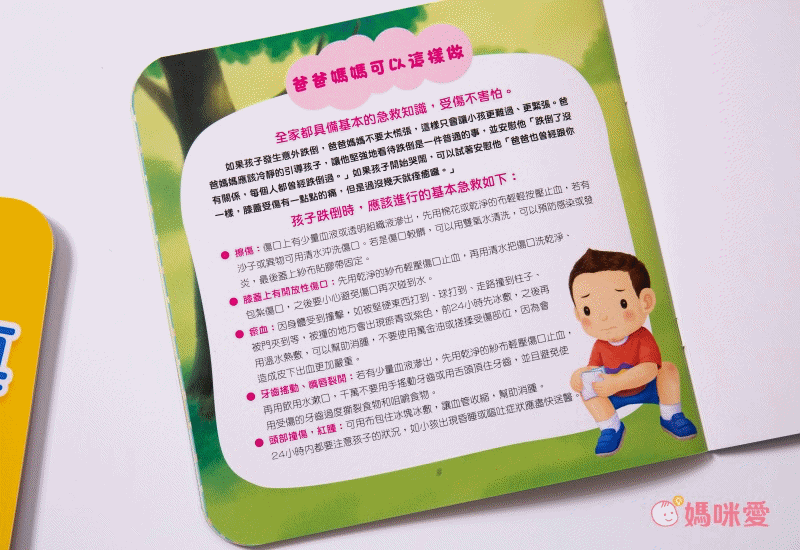 故事中的丹丹為了追小貓咪而跌倒了,也讓阿噹想起自己去公園跑跳不小心跌倒時,腳受傷的情境,而且繪本中進一步延伸受傷時簡易處理傷口的方式,也可以讓小孩了解受傷了不是只能放聲大哭,也可以自己簡單清洗傷口再找大人協助喔!