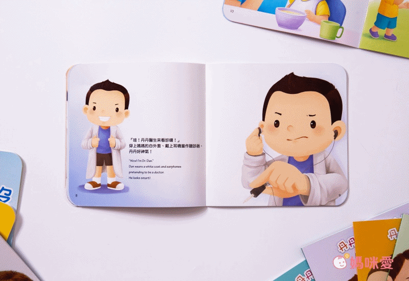 每次提及「醫生、醫院、打針」,相信一樣是很多小小孩心中沒辦法跨越的恐懼,書中的丹丹本來很害怕看醫生打針,經過扮演醫生的遊戲,成功的化解心中的恐懼,很勇敢地打預防針。阿噹平常在家就很愛和姊姊玩醫生和病人的角色扮演遊戲,通過繪本,又更能夠理解為什麼要定時打預防針囉!