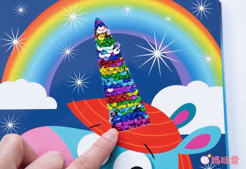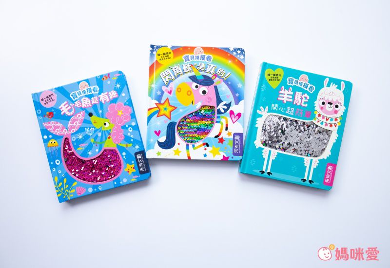 3本書一字排開,小小孩光看到封面就快要失心瘋!尤其中間彩色亮片的獨角獸那一本,編媽家兩隻一看到就異口同聲搶著!從封面就可以開始玩,果真是名副其實,最閃耀、最療癒的亮片書。