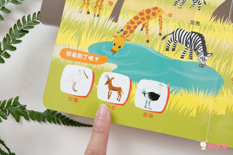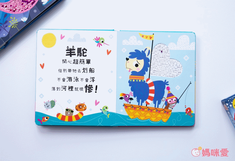 除了亮片之外,書中還有很多小細節可以看,像羊駝吃香蕉的地方就有鳳梨、葡萄、奇異果等,可以帶孩子認識水果。像開心果這年紀的小朋友,在撥亮片的時候要很專心控制手指頭才能順利翻開,媽咪我覺得是超棒的手眼協調和觸覺刺激。