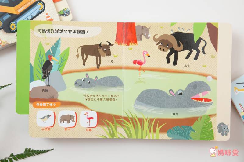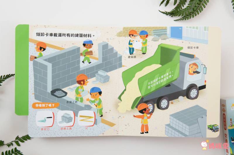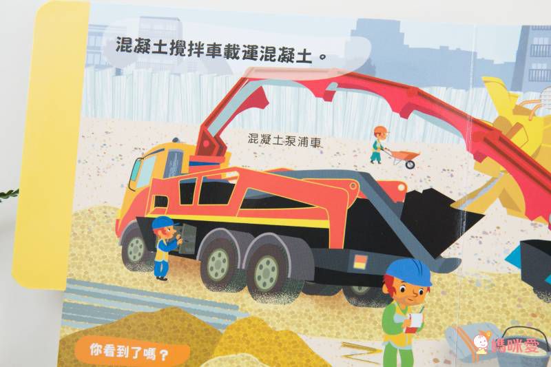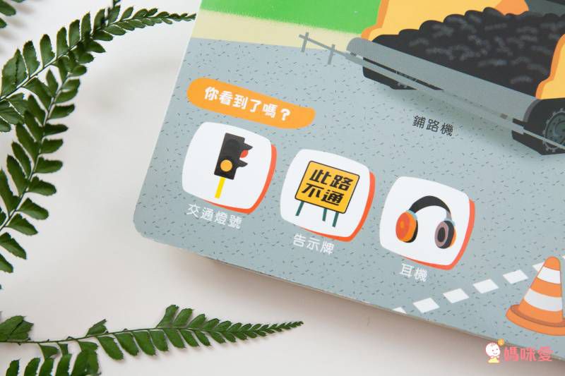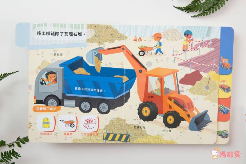 每一頁還有「找找看遊戲」,左下角都有三個工地小物藏在工地裡,還可以跟小寶貝來玩找找看,訓練小寶貝的專注力與發現力喔!