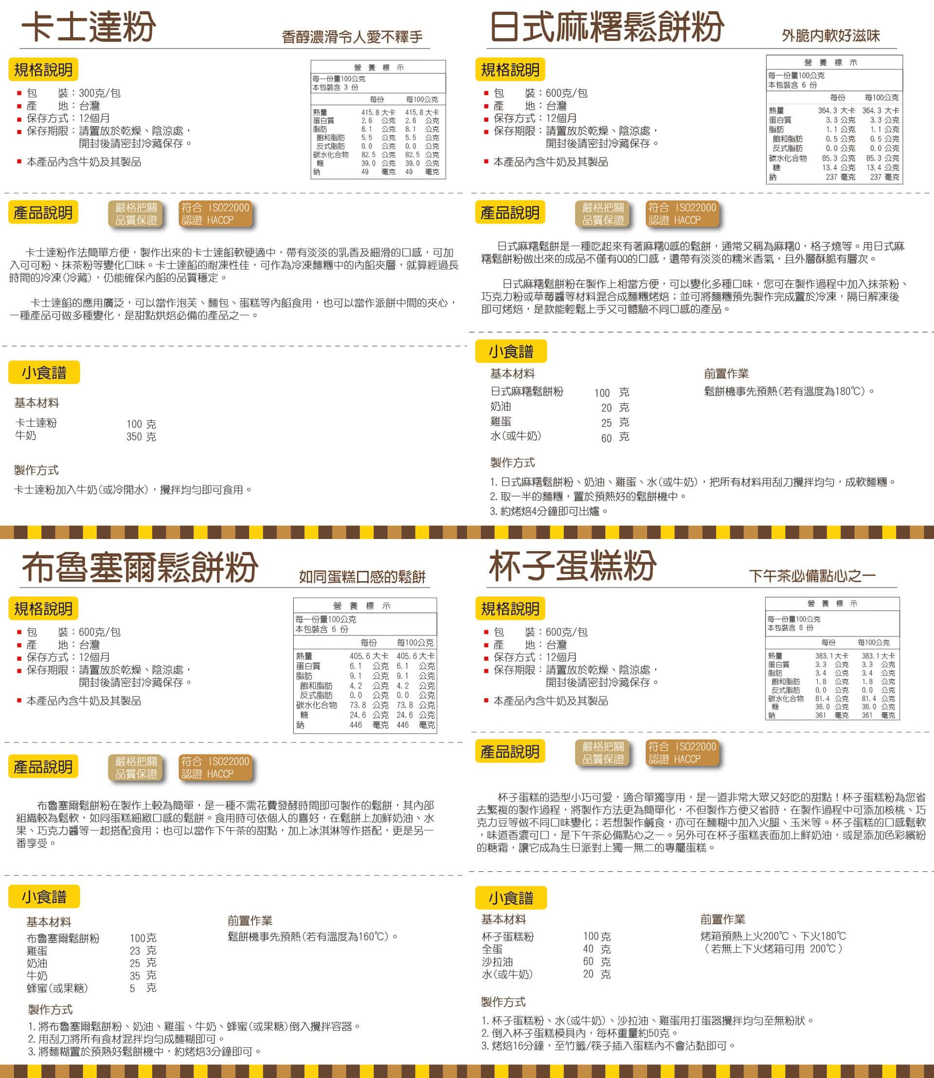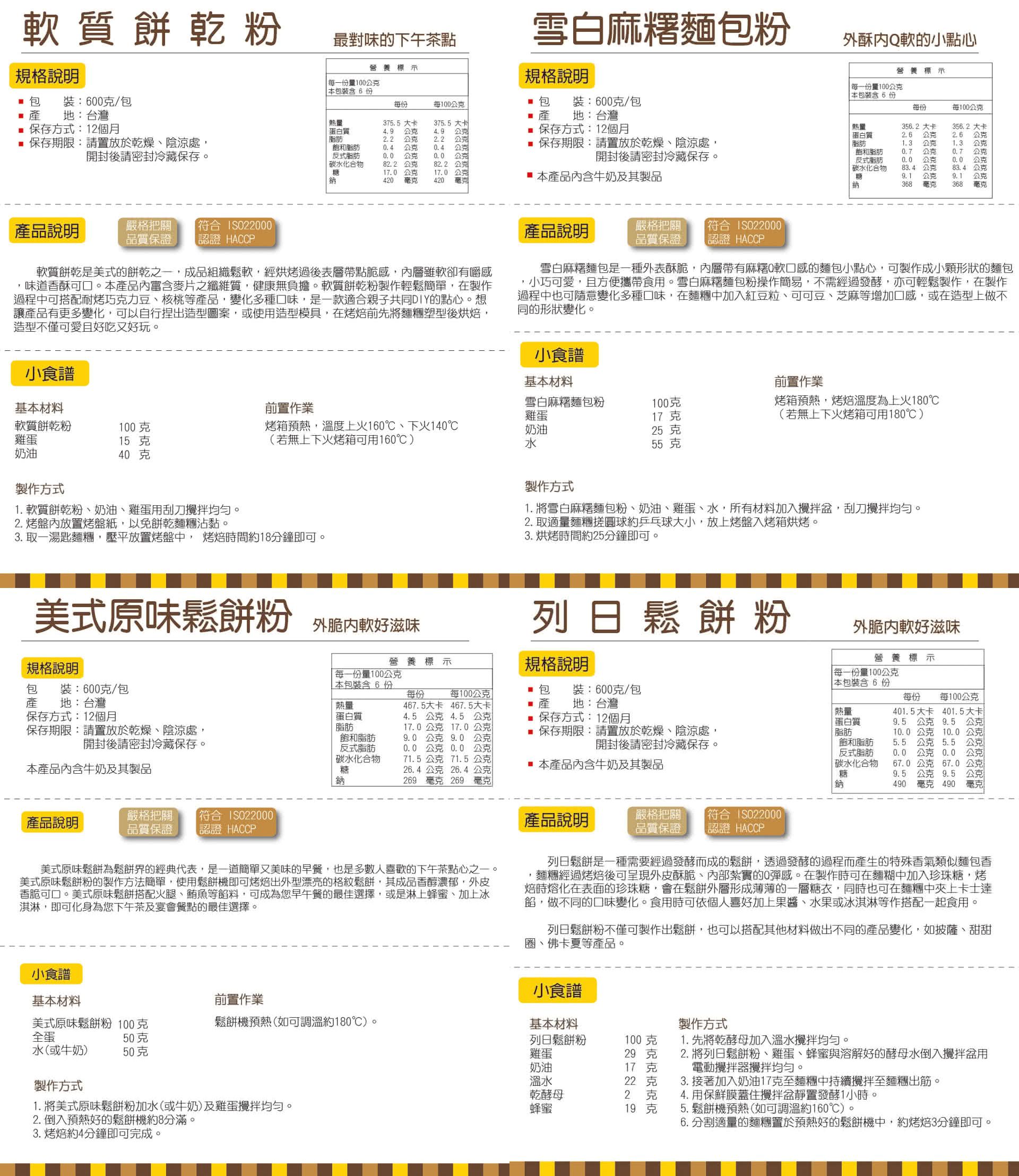 口味:法式可可、日本抹茶、沖繩黑糖、加拿大楓糖、天然原味、北海道特製減醣鬆餅粉