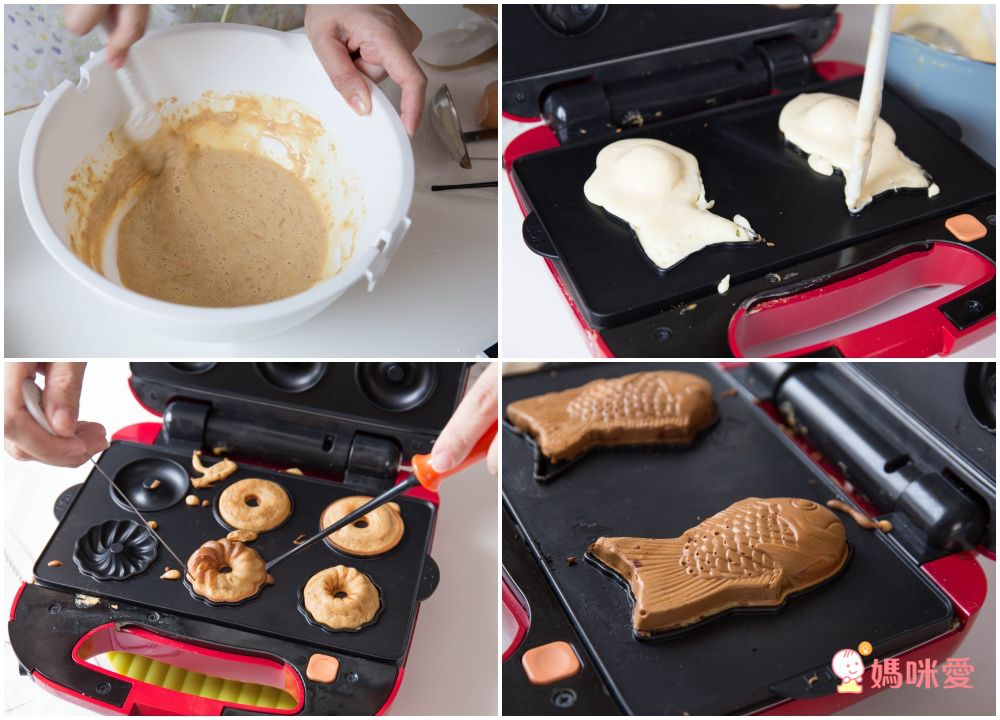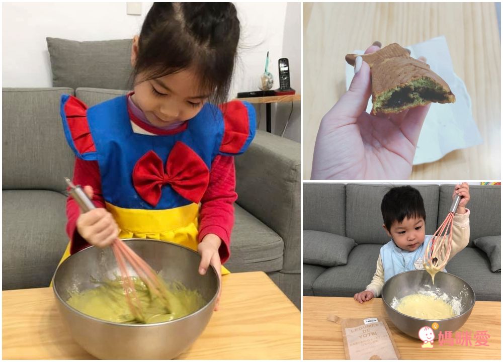 當然,最經典的日式鯛魚燒一定不能錯過的就是抹茶紅豆了!準備抹茶風味的鬆餅粉,以及蜜漬紅豆,跟著上面的步驟做,抹茶香味佐以紅豆香甜的鯛魚燒就出爐啦!有時候假日下雨,又想和孩子一起進行休閒娛樂,這時候一起做點簡單的甜點就超適合,薇薇和鬧鬧姊弟倆自告奮勇的要幫媽媽攪拌,最後看著成品出爐也超有成就感呀。