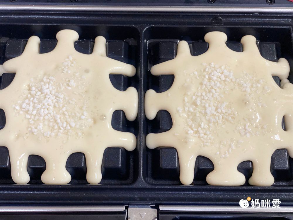 3.鬆餅機預熱後即可將麵粉糊倒入