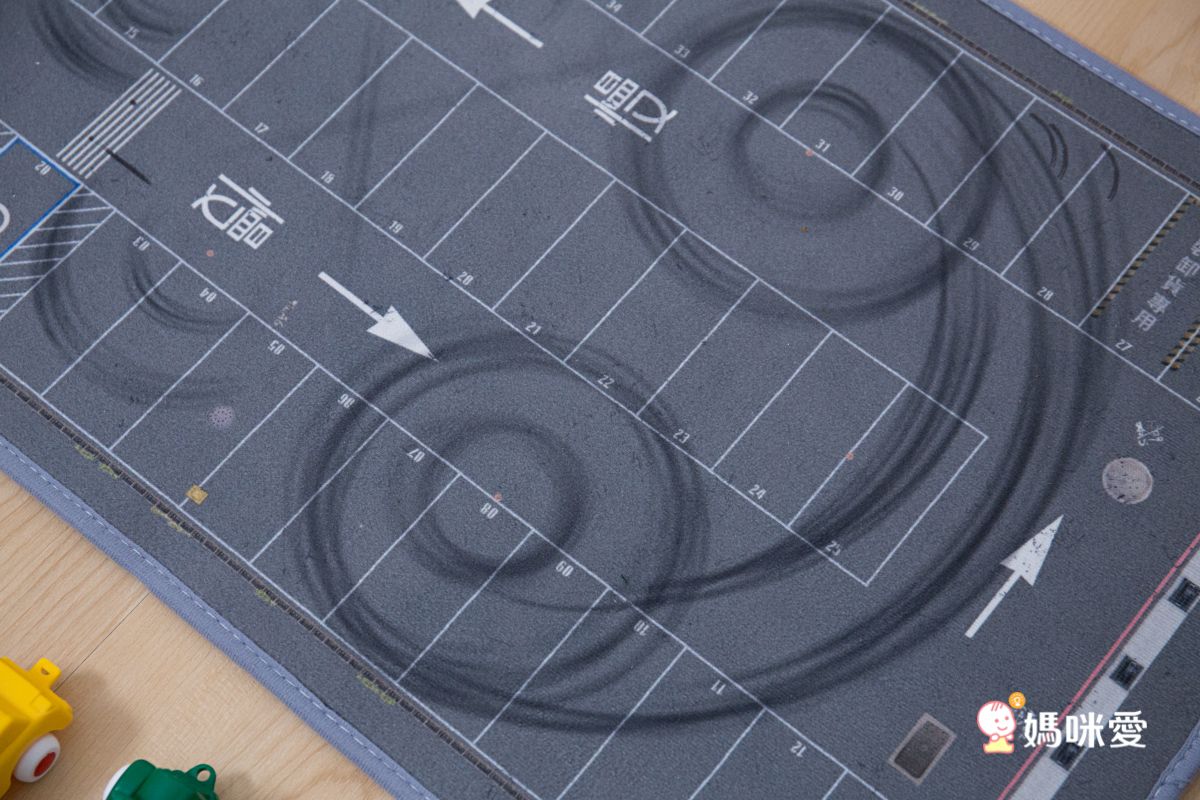 【玩具車收納地毯-擬真停車場】刻畫許多超精細的細節,像是地上的指標、甩尾痕、煞車痕等。讓孩子們在地毯上一起尬車囉~