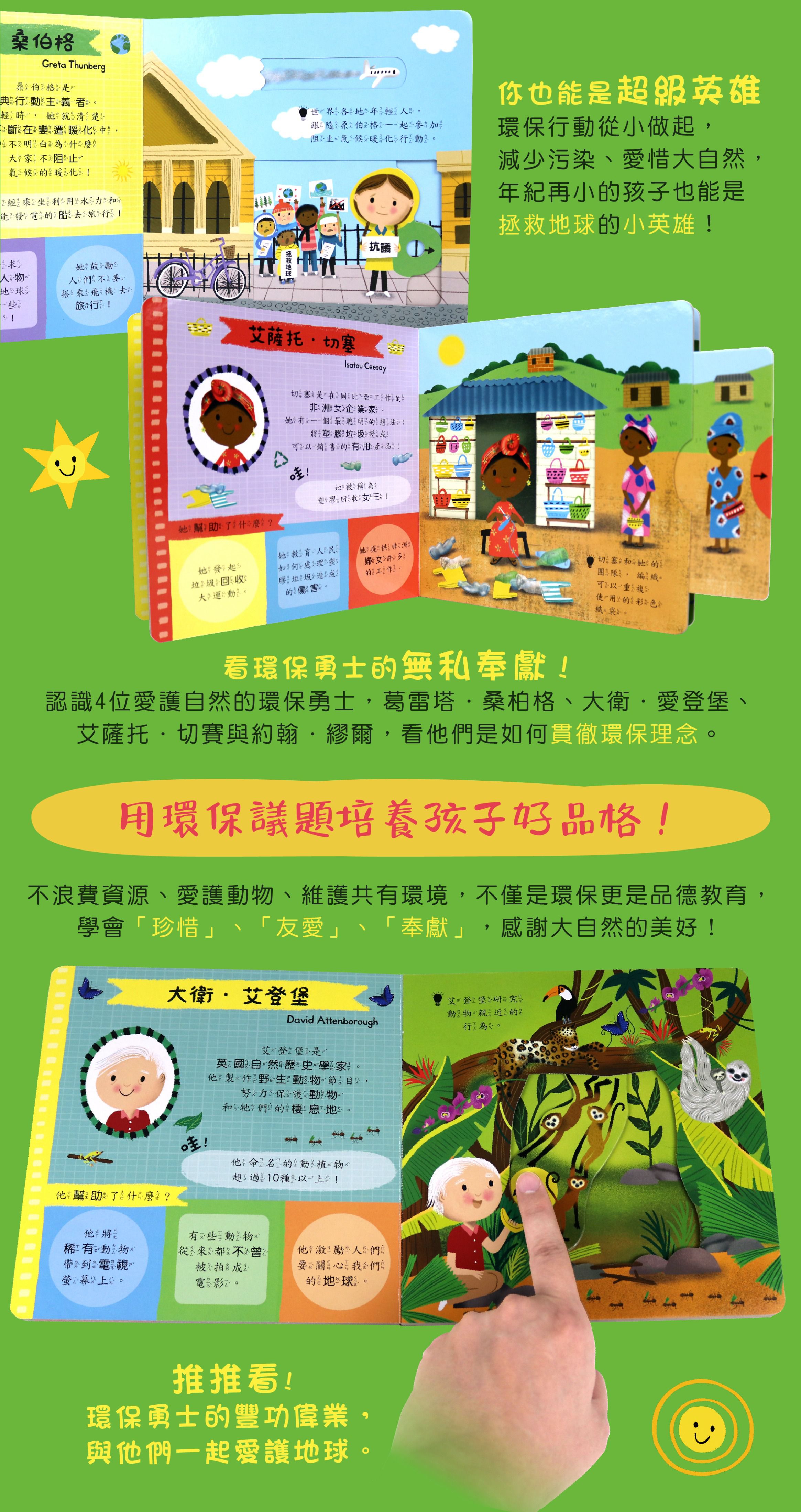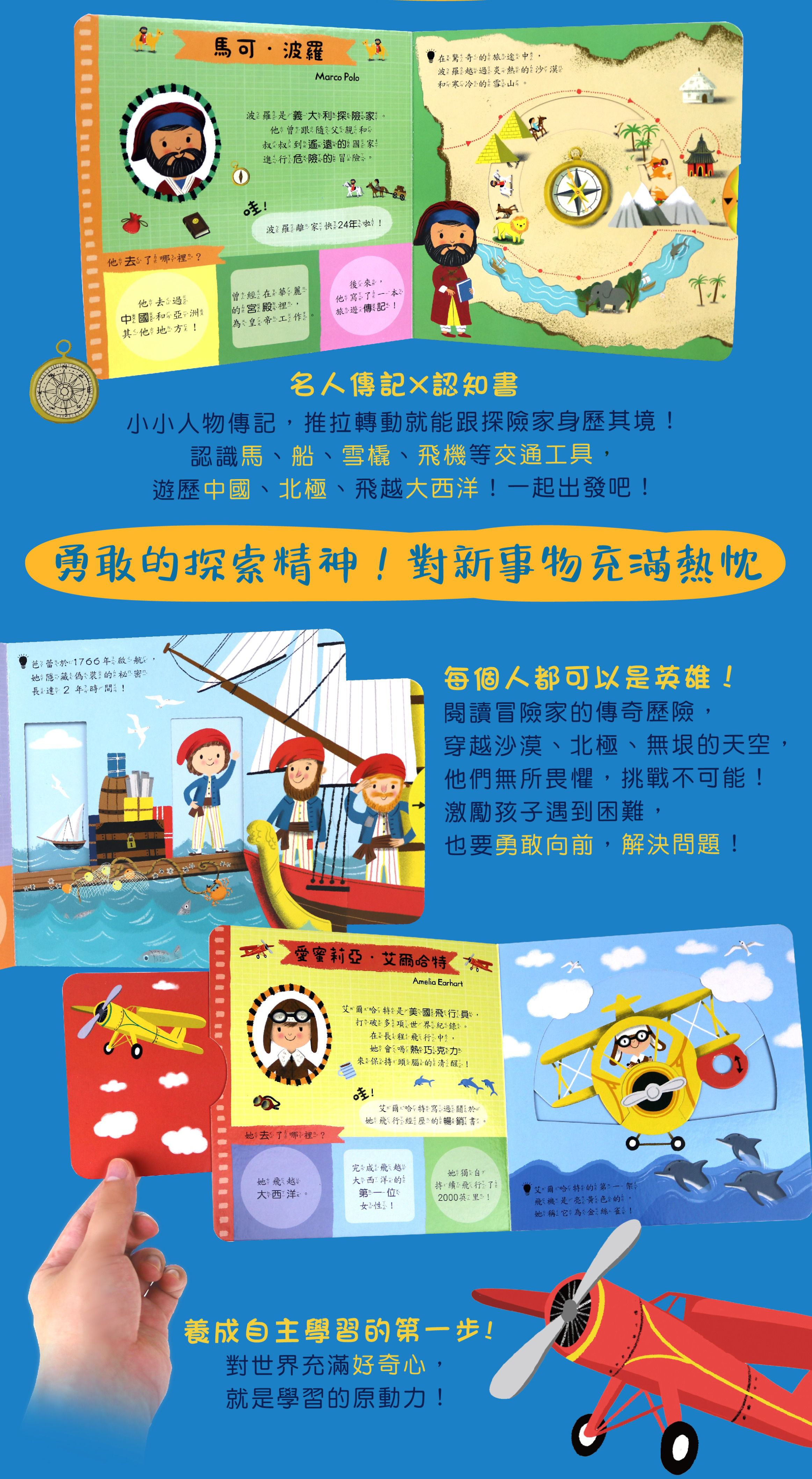在孩⼦的世界裡,爸爸無所不能,是他們⼩⼩世界的⼤英雄,但其實除了爸爸之外還有更多值得認識的偉⼈,這款推拉書透過「推、拉、轉」的遊戲,正好能帶孩子認識在各個領域改變世界的英雄們!