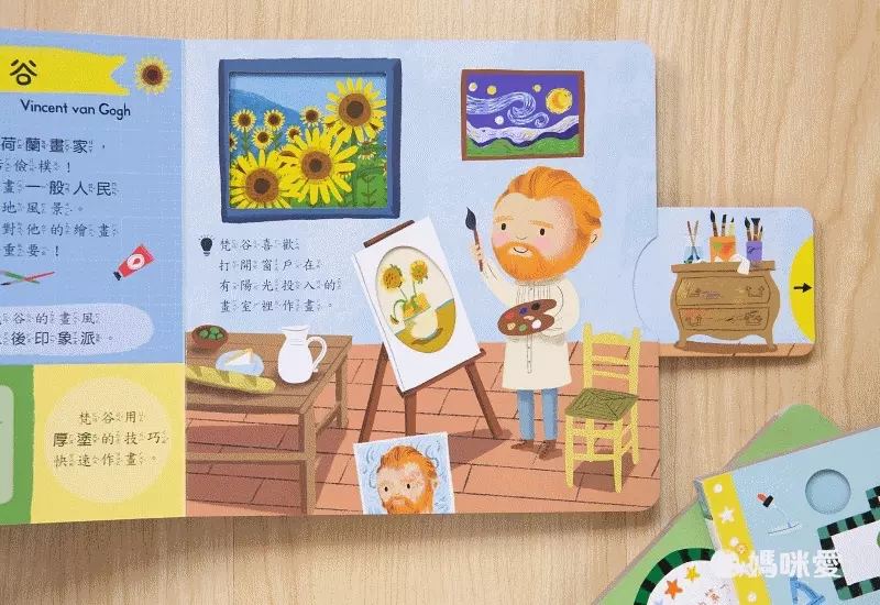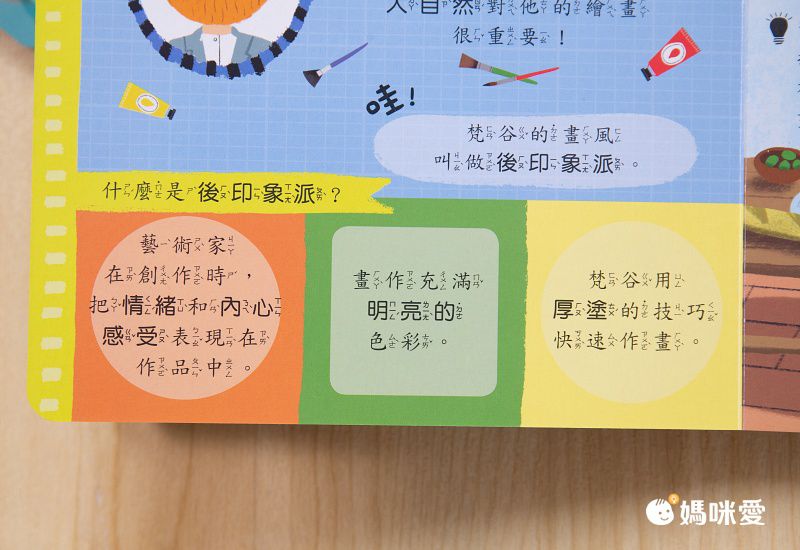 這本書也有帶孩子認識不同的畫風唷!像梵谷就屬於後印象派,書中還特別用粗體和色塊標示重點呢