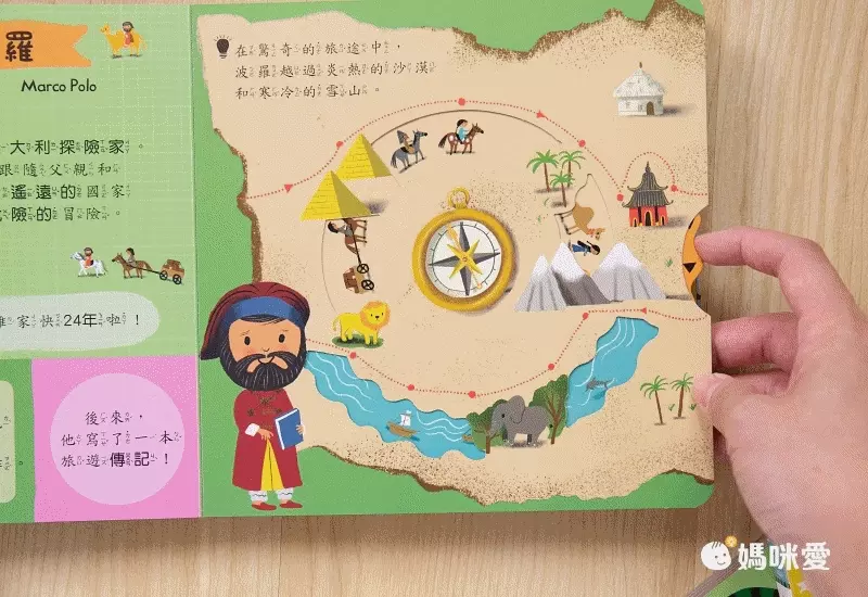 這系列附有注音,所以其實如果孩子已經會識字了,也可以當成知識書來閱讀喔!轉一轉,跟著馬可波羅跨越沙漢和雪山