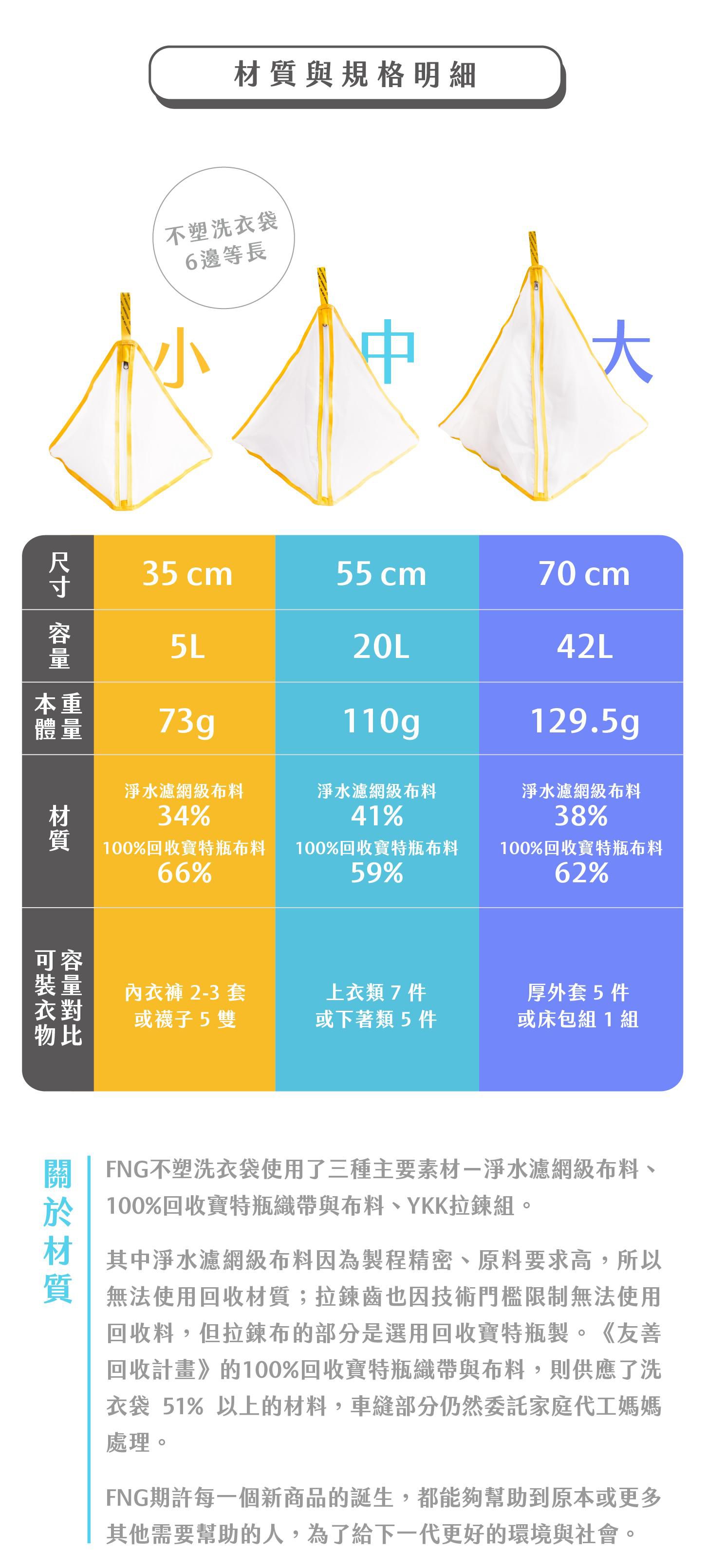一起加入FNG不塑洗衣袋的行列,為下一代環境盡一份心力!共有三個尺寸可以選擇,也做了比較表給媽咪參考喔!