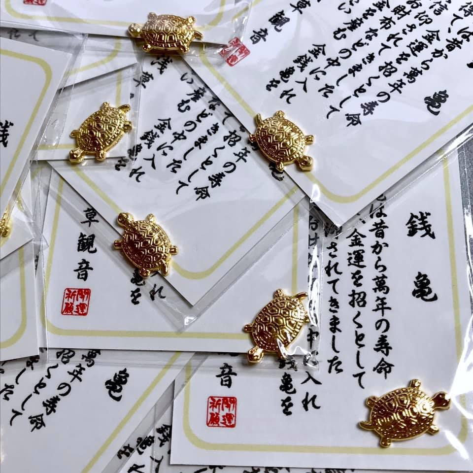 日本淺草觀音寺的錢龜,有別於市面有的另一版塑膠鍍金的錢龜。這款尺寸稍微小一點,但確相當有份量感!每個金龜都約有1g的合金重!