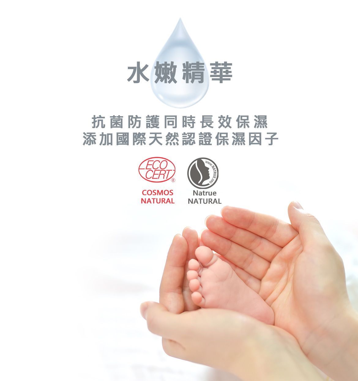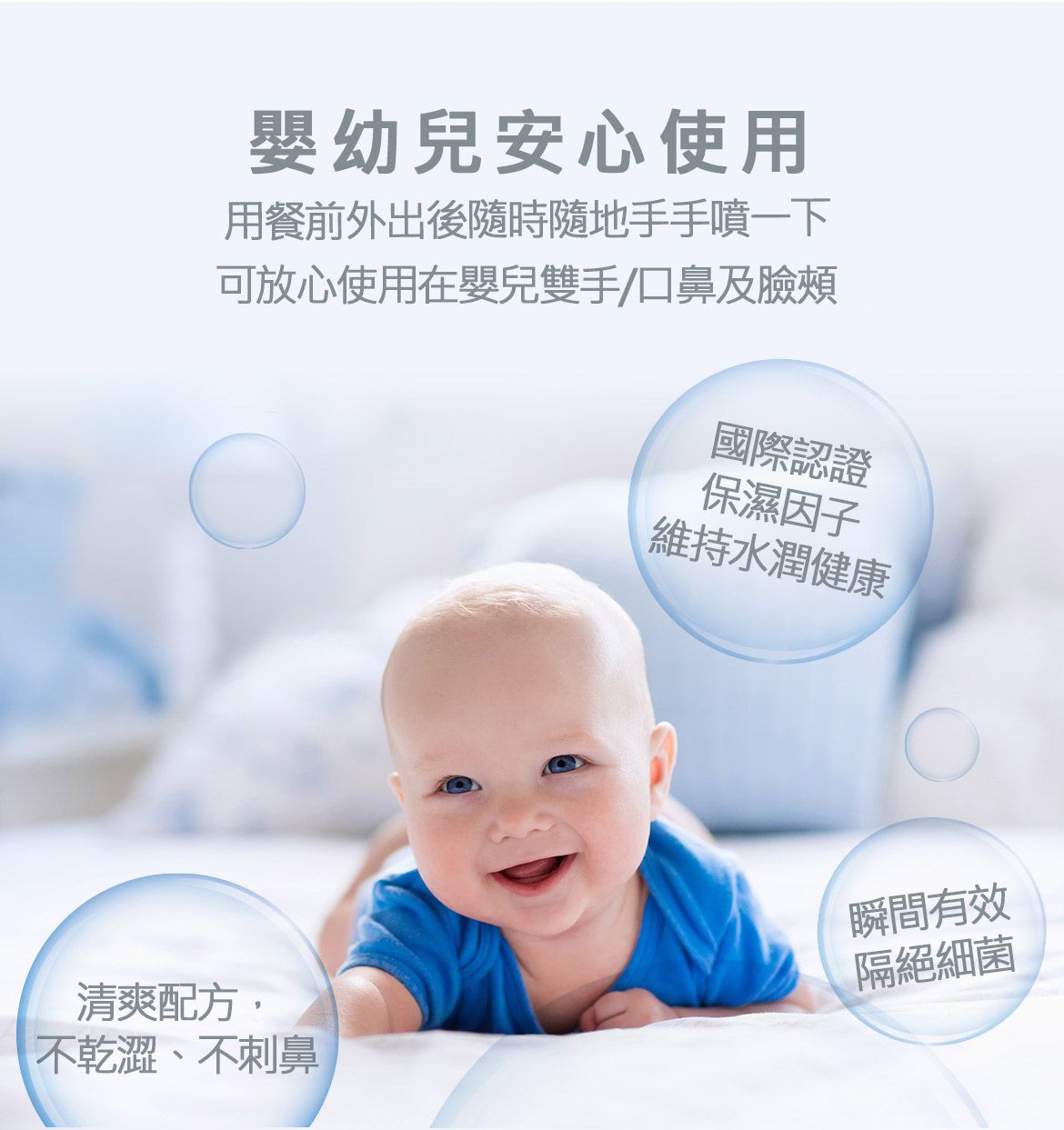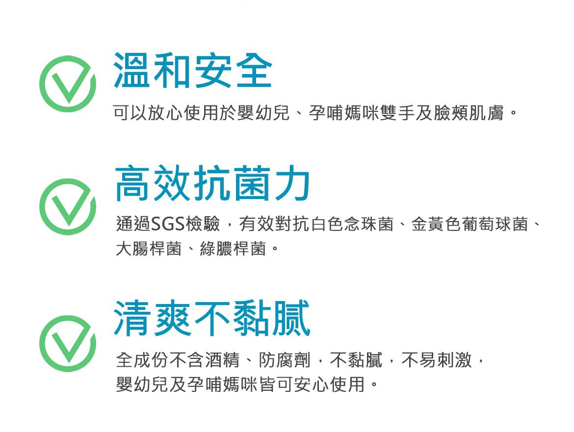 通過SGS檢驗抗菌力達99.99%,衛福部認可繖花醇+天然植物清爽配方,安全溫和不易刺激,新生兒肌膚也適用!