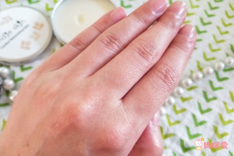 這是均勻塗抹後的樣子。植愉滋潤修護膏含有滋潤的乳油木果脂、冷壓萃取橄欖果脂,可以好好的滋潤雙手,腳跟的龜裂處也可以塗抹