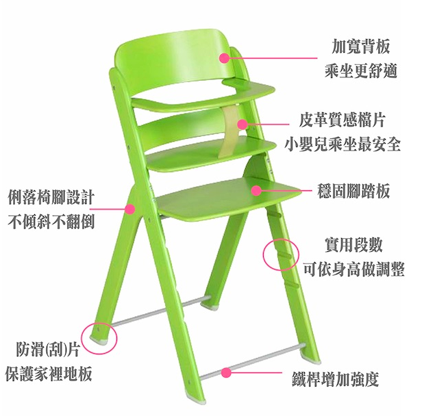 椅腳中間加裝了鐵桿設計,讓椅子更穩固,安全性更高!加寬的椅背板、弧形、人體工學設計讓小童能夠有正確的坐姿,高靠背也能保護寶寶的肩、背部。圓滑的外型,除了美觀以外,也不怕家中寶貝撞到較方、較尖銳的邊角而受傷了。如果媽咪家裡是木頭地板,椅腳防刮片,保護家裡的木頭地板!