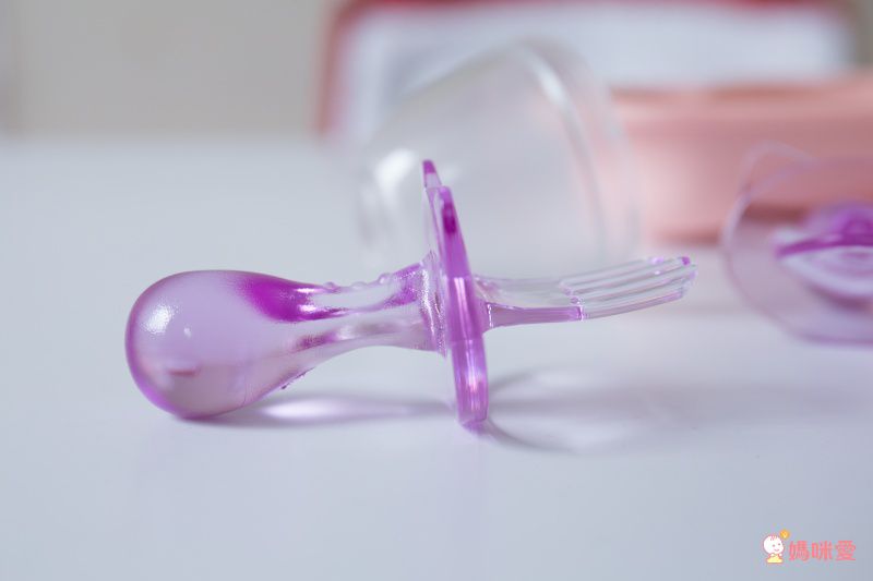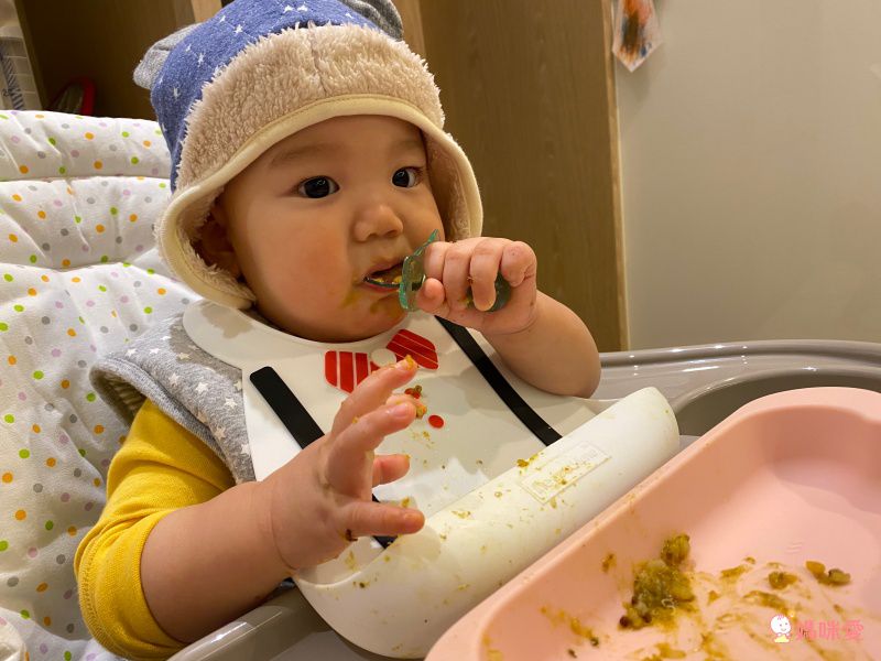 握把對九個月大的小鳳梨來說非常好抓握。因為鳳梨媽還沒有讓小鳳梨自己拿餐具吃過東西,這次一拿到小湯匙和小叉子,就直接讓小鳳梨試試看,一開始小鳳梨拿到,本來還在困惑要怎麼拿來吃才對,結果沒有想到,過幾分鐘,小鳳梨就自己找到對的方式把東西放進嘴巴吃了!連爸爸看到都覺得神奇呢!這組蛋形餐具讓寶寶自己練習挖東西吃實在是很不錯呢!
