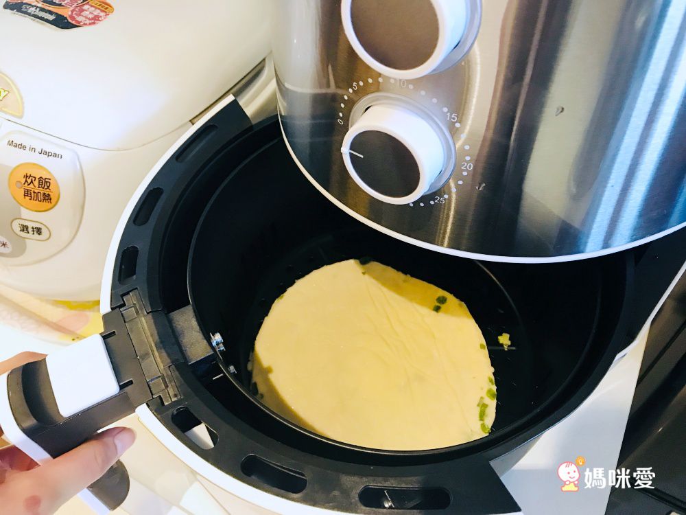 以前處理蔥抓餅都要放在平底鍋上顧半天翻來翻去,現在只要丟在氣炸鍋裡定時,中間拿出來翻一下面就好