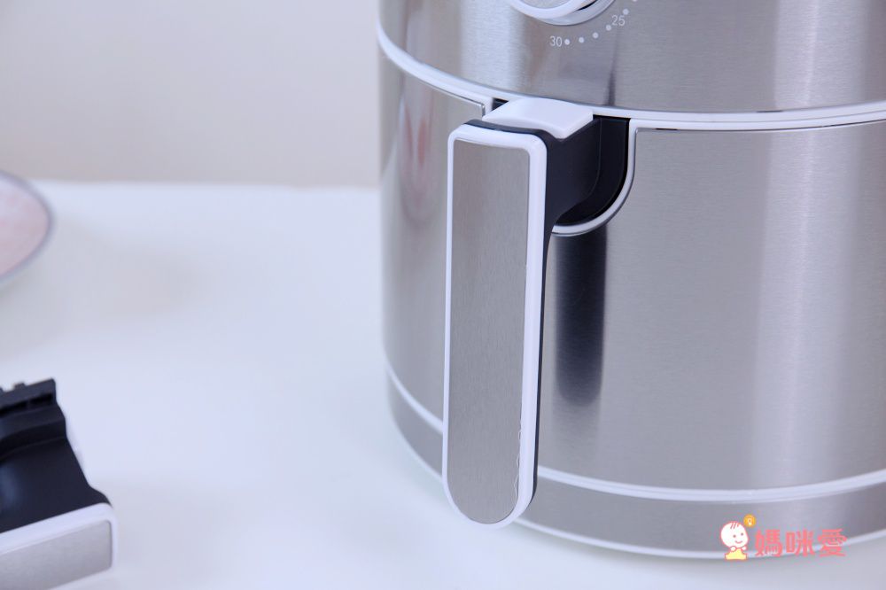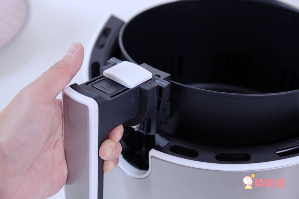 把手上還有一個防呆設計,就是要取出炸藍或外鍋的時候需要先把白色的擋片推開,再按下按鈕才能取出唷