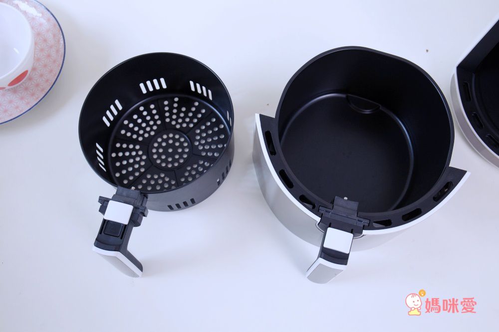 有些氣炸鍋是只能用內鍋,外鍋沒有把手是無法獨立使用的!Pecobono 就是這麼貼心附上雙手把,內鍋外鍋都可以烹調。內鍋炸籃的容量是4L、外鍋則是5L連一隻全雞都可以放進去喔~