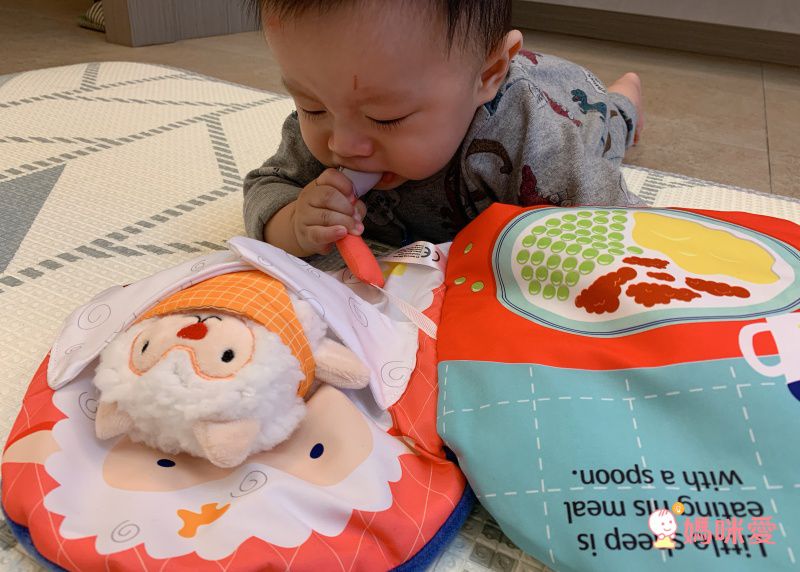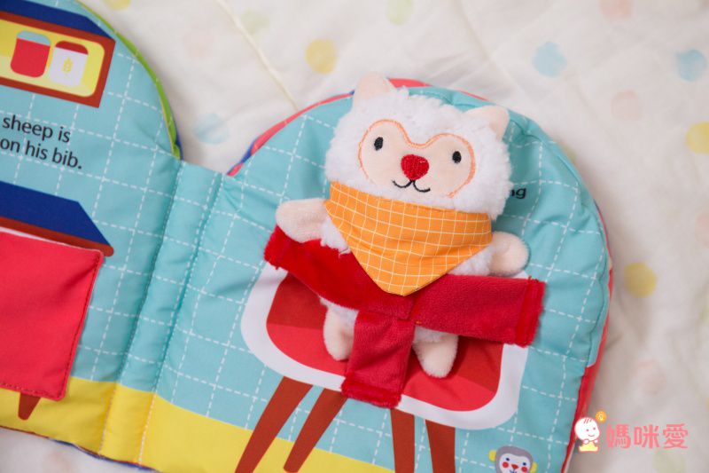 這本布書總共有6頁,每一頁都有互動的主題,像是第一頁是小羊要準備開飯了~媽媽可以拉一下小搖鈴,呼喚小羊來準備吃飯,接下來就是洗手準備吃飯,洗完手記得要擦乾唷~(布書頁面上有一塊布) 翻到下一頁櫃子裡可以拿出圍兜兜,柑仔很努力的在幫「毛絨絨」穿上圍兜兜.....霹靂在旁邊都看傻了